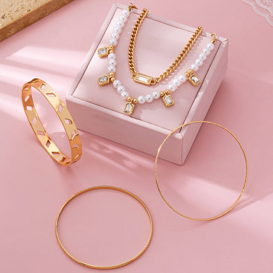 Gold Pearl & Crystal Drop Layered Bracelet Set | 80B1618