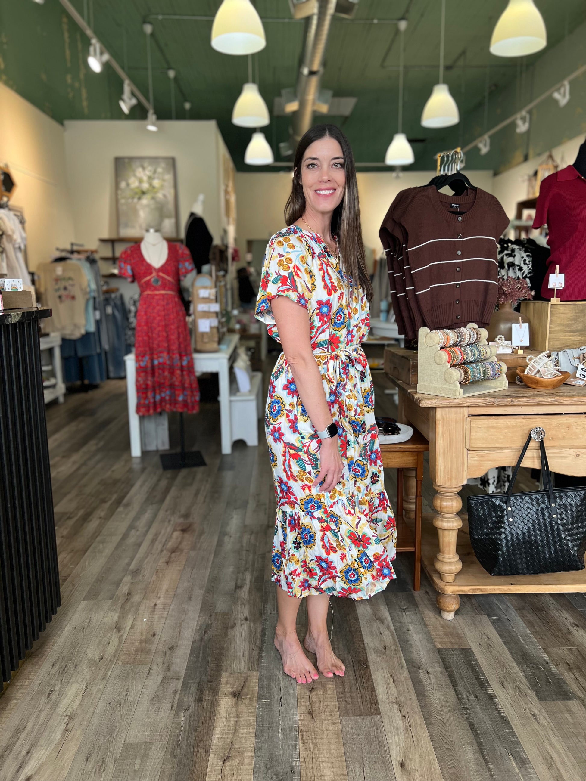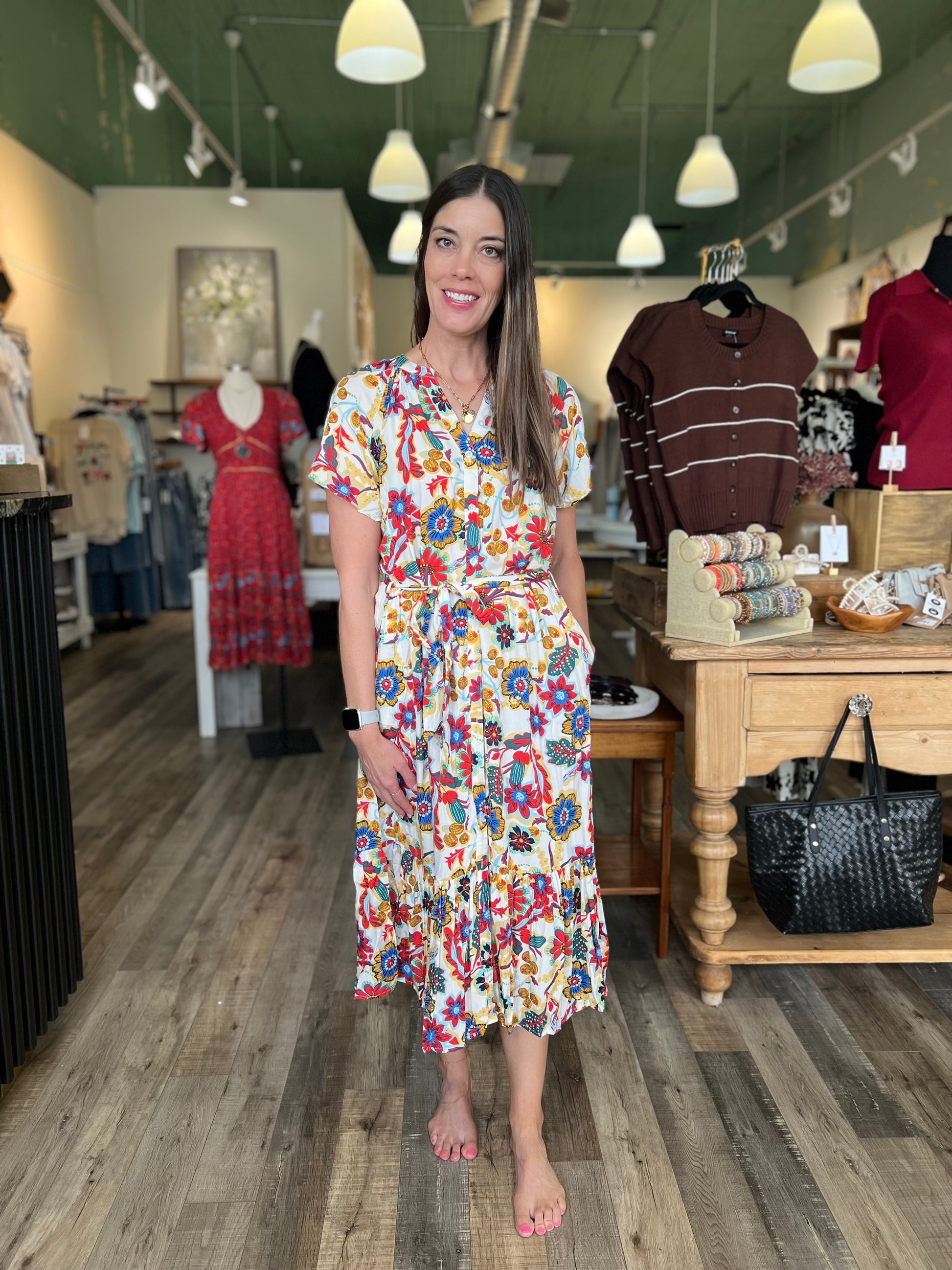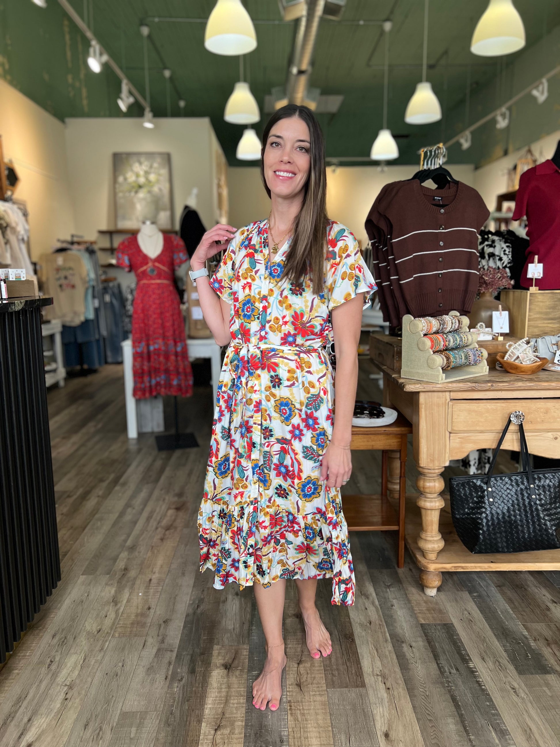 Embrace effortless elegance with the Angela Multicolor Floral Maxi Dress. Featuring a soft off-white base adorned with vibrant red, blue, and yellow floral prints, this button-up dress combines classic charm with modern style. The tie waist accentuates your silhouette, offering a flattering fit for any occasion. Perfect for brunches, garden parties, or weekend outings, this maxi dress delivers both comfort and standout beauty.