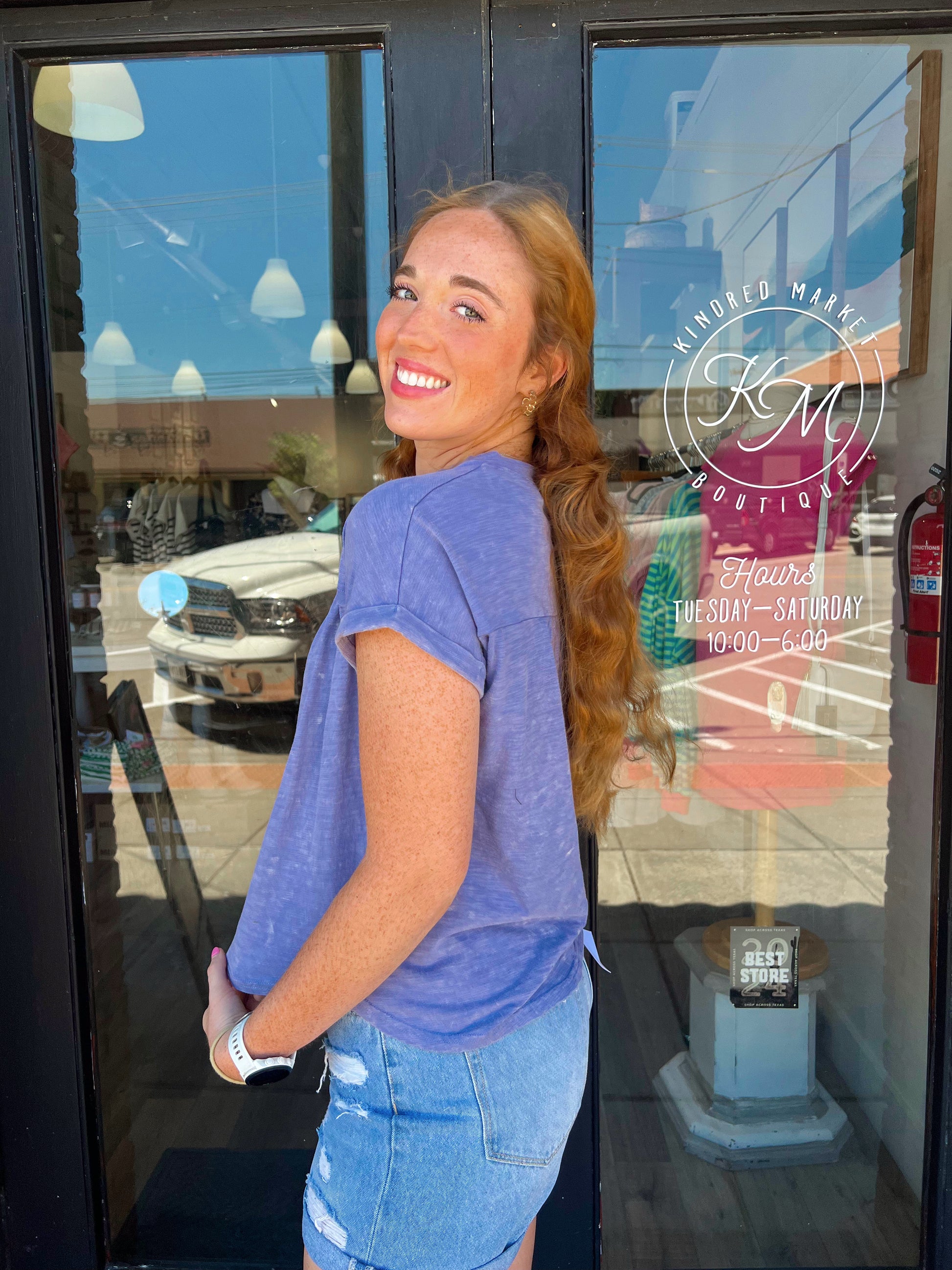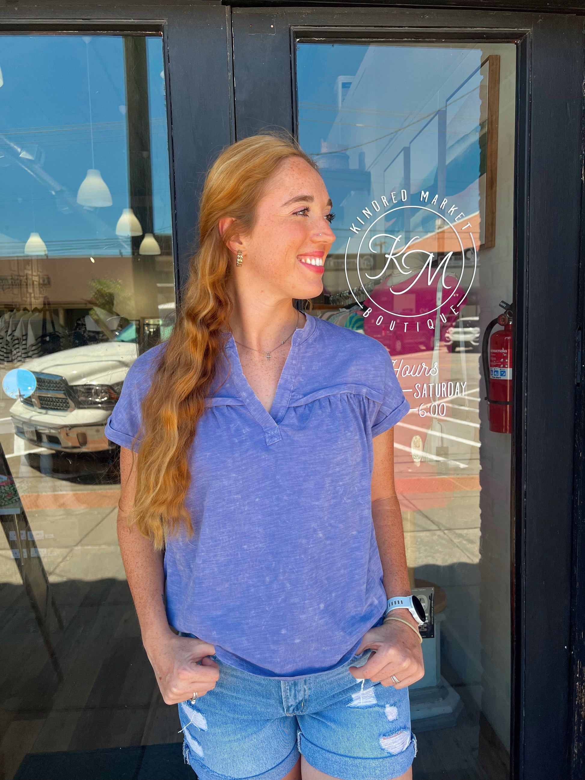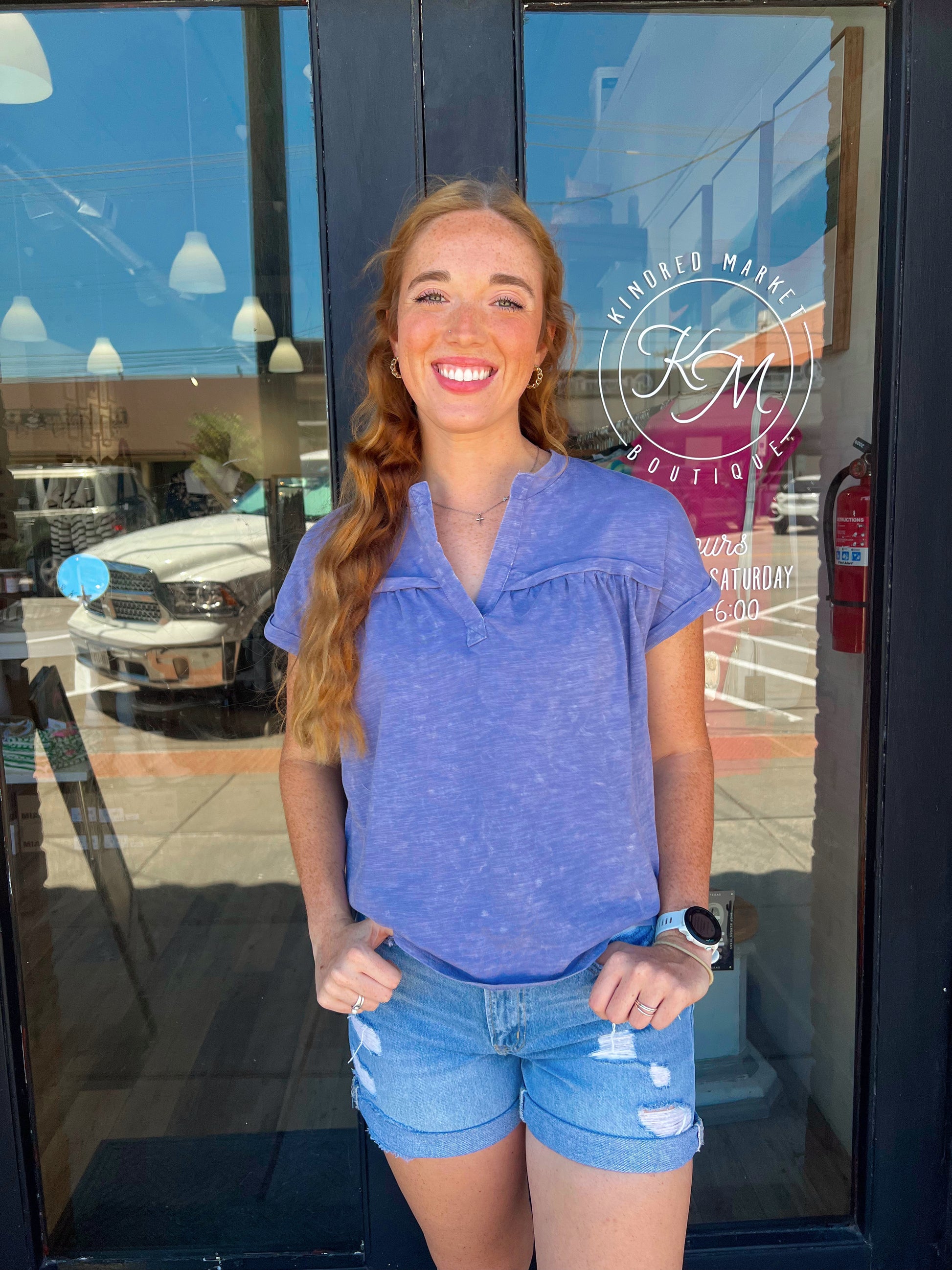 The Arden Denim Casual T-Shirt is such a good everyday basic. The denim has a little bit of an acid washed look to it that elevates it. There are cuffs around the short sleeves, and cute cuffing and stitch detail around the v neck. There is also a cute ruched detail towards the top of the T-Shirt, this just brings so much detail to the top. The material is your normal T-Shirt fabric. Thick but not too hot and breathable. It is made from 100% rayon. This one is perfect to be paired with some white or black denim and some super cute sneakers.