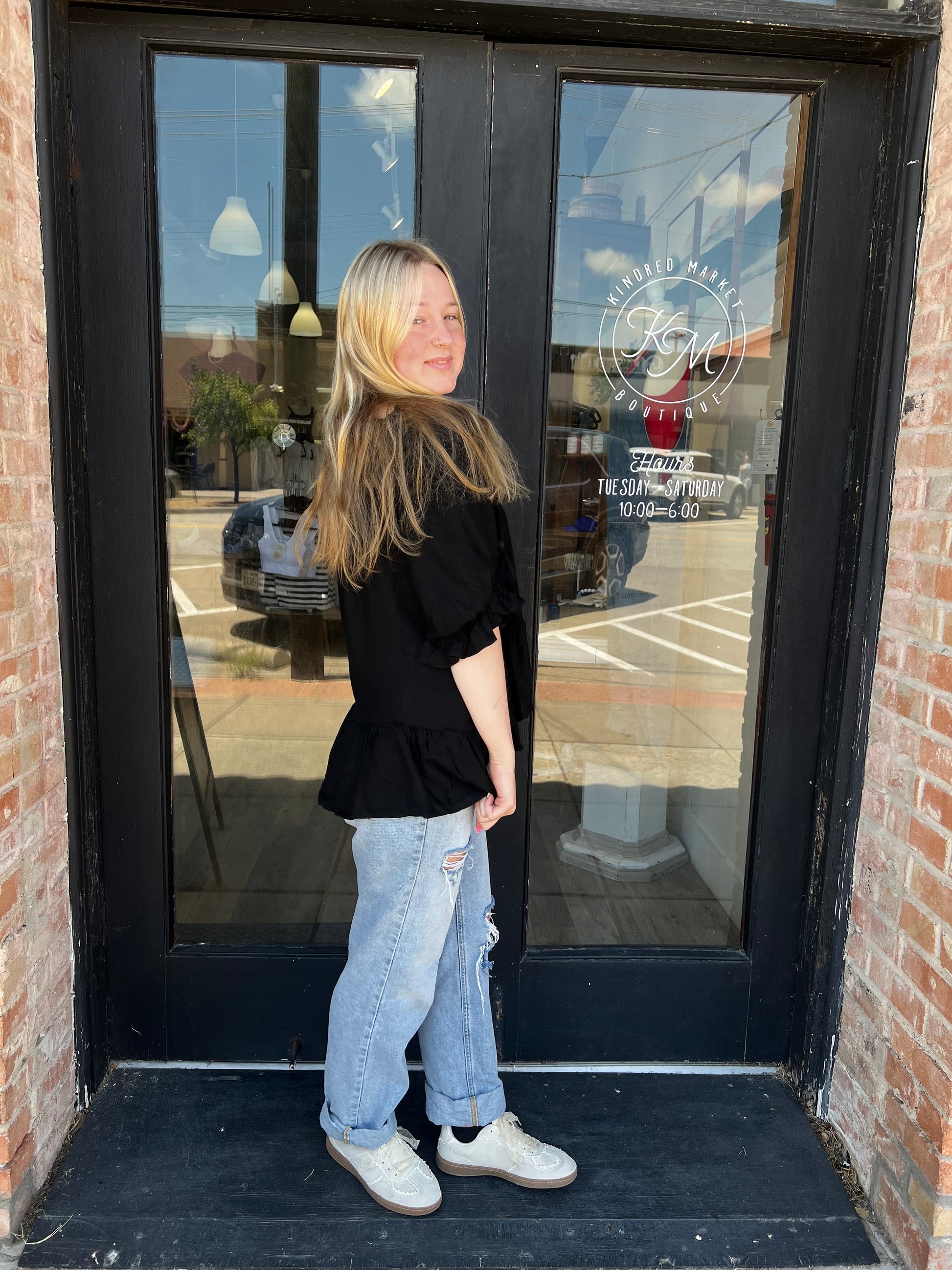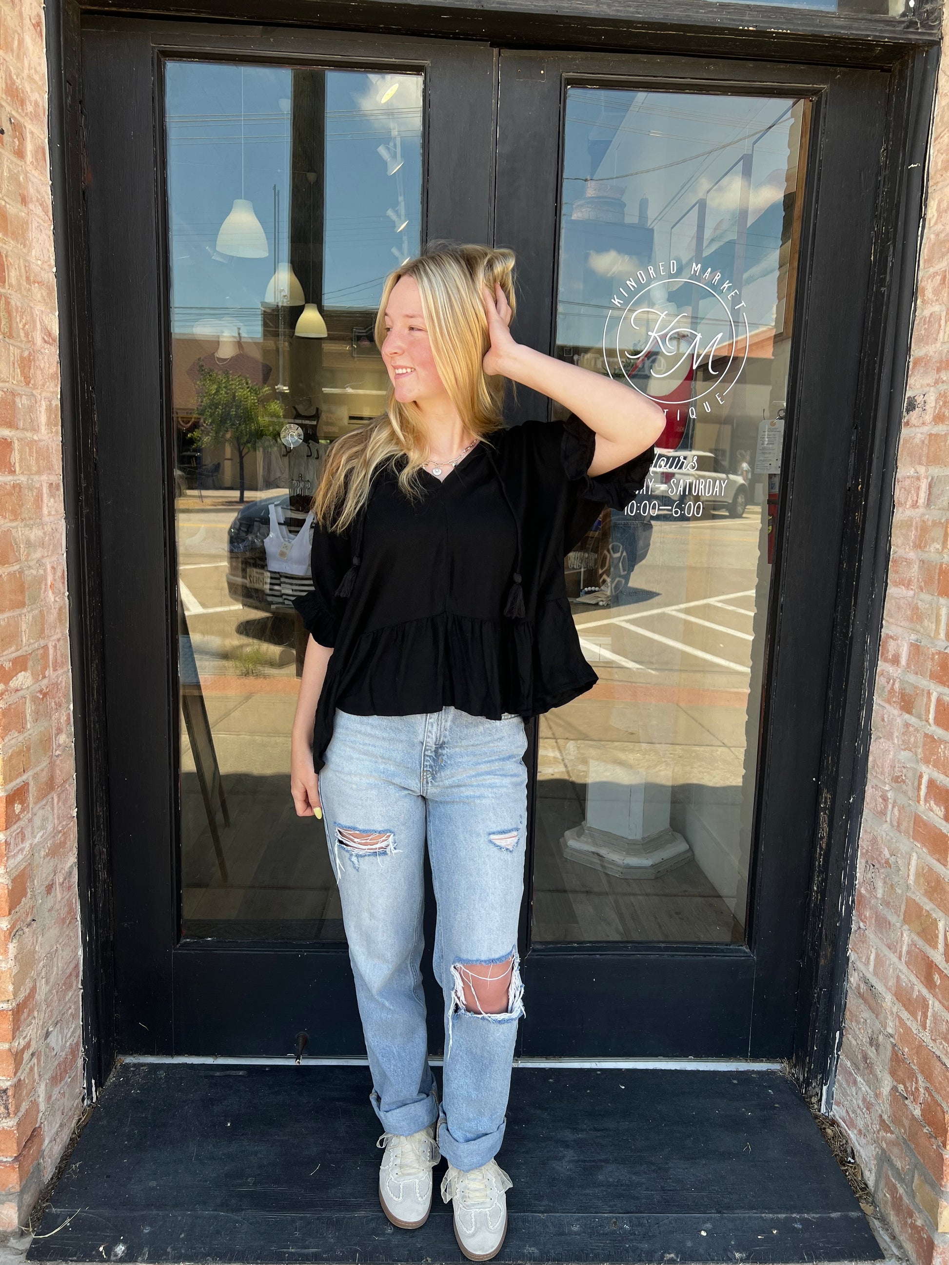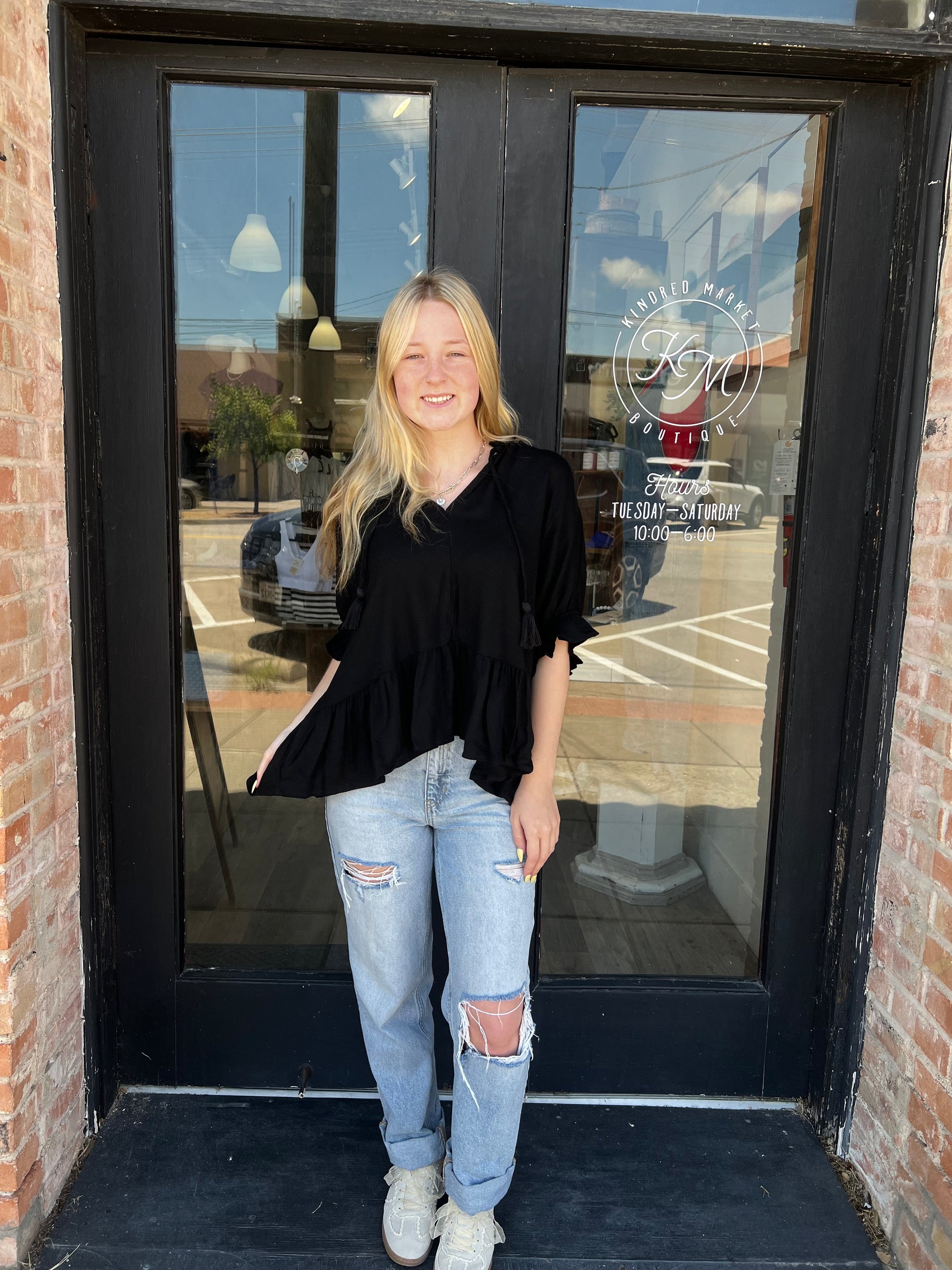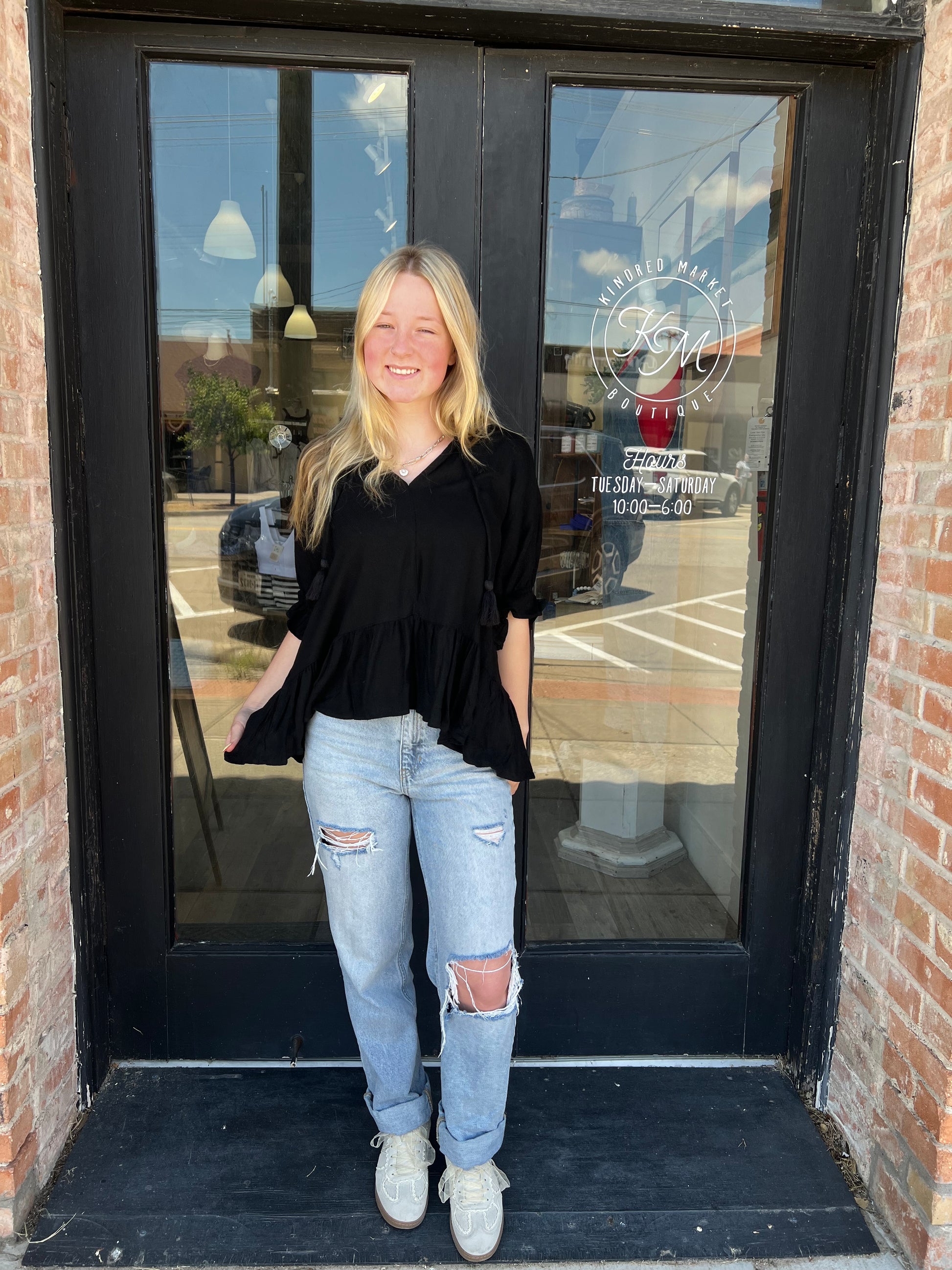 Elevate your wardrobe with the Ashleigh Black Linen Blouse, featuring breathable linen fabric and a flattering quarter sleeve design. The delicate tassel tie adds a touch of charm, while the ruffle hem creates a graceful silhouette. Perfect for both casual outings and polished looks, this blouse combines comfort and style effortlessly.