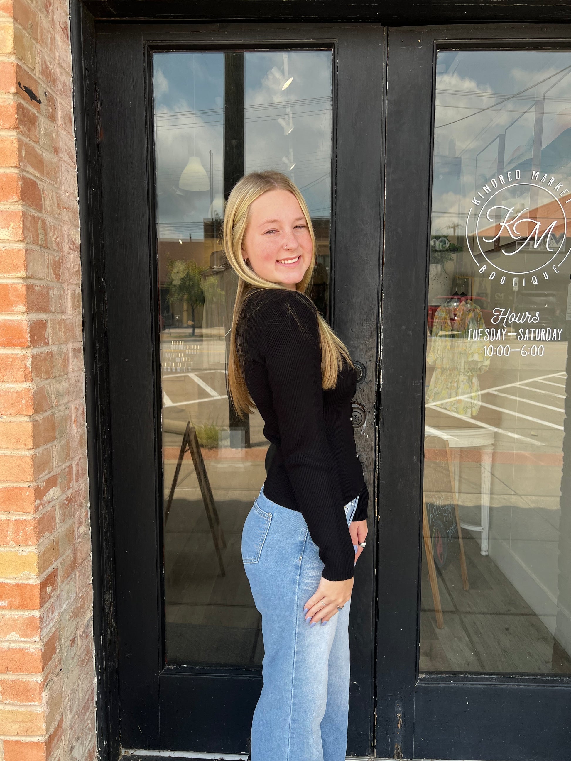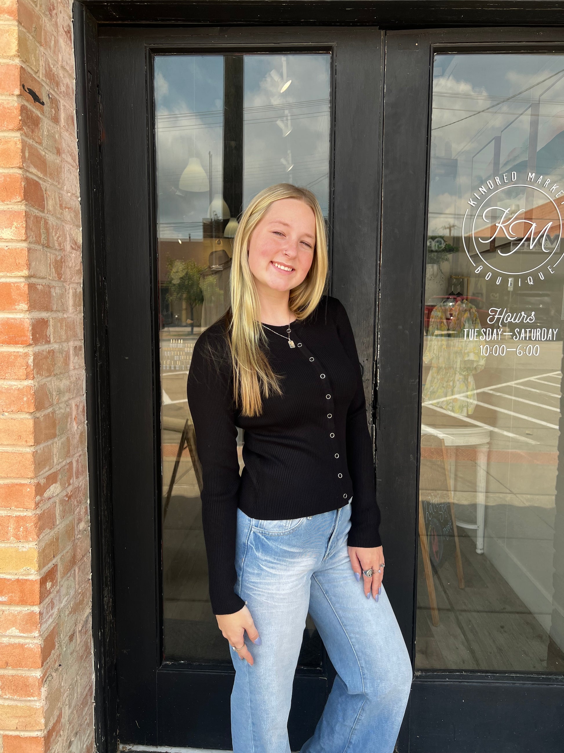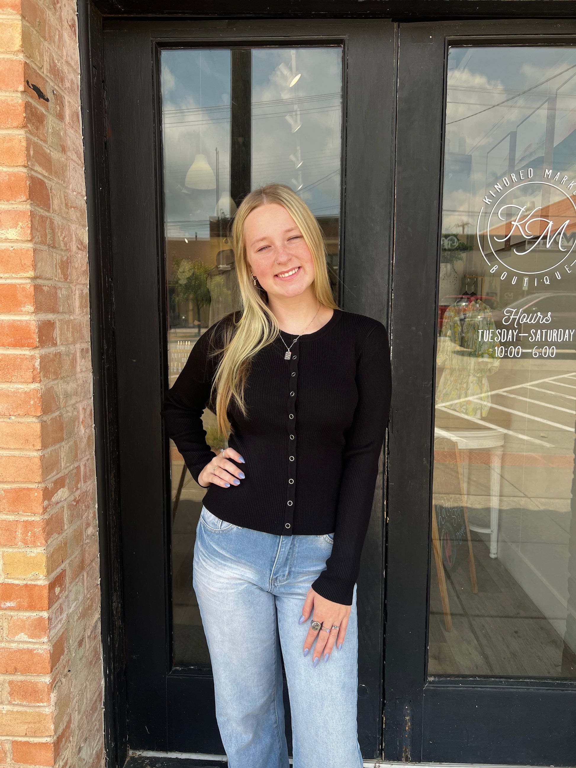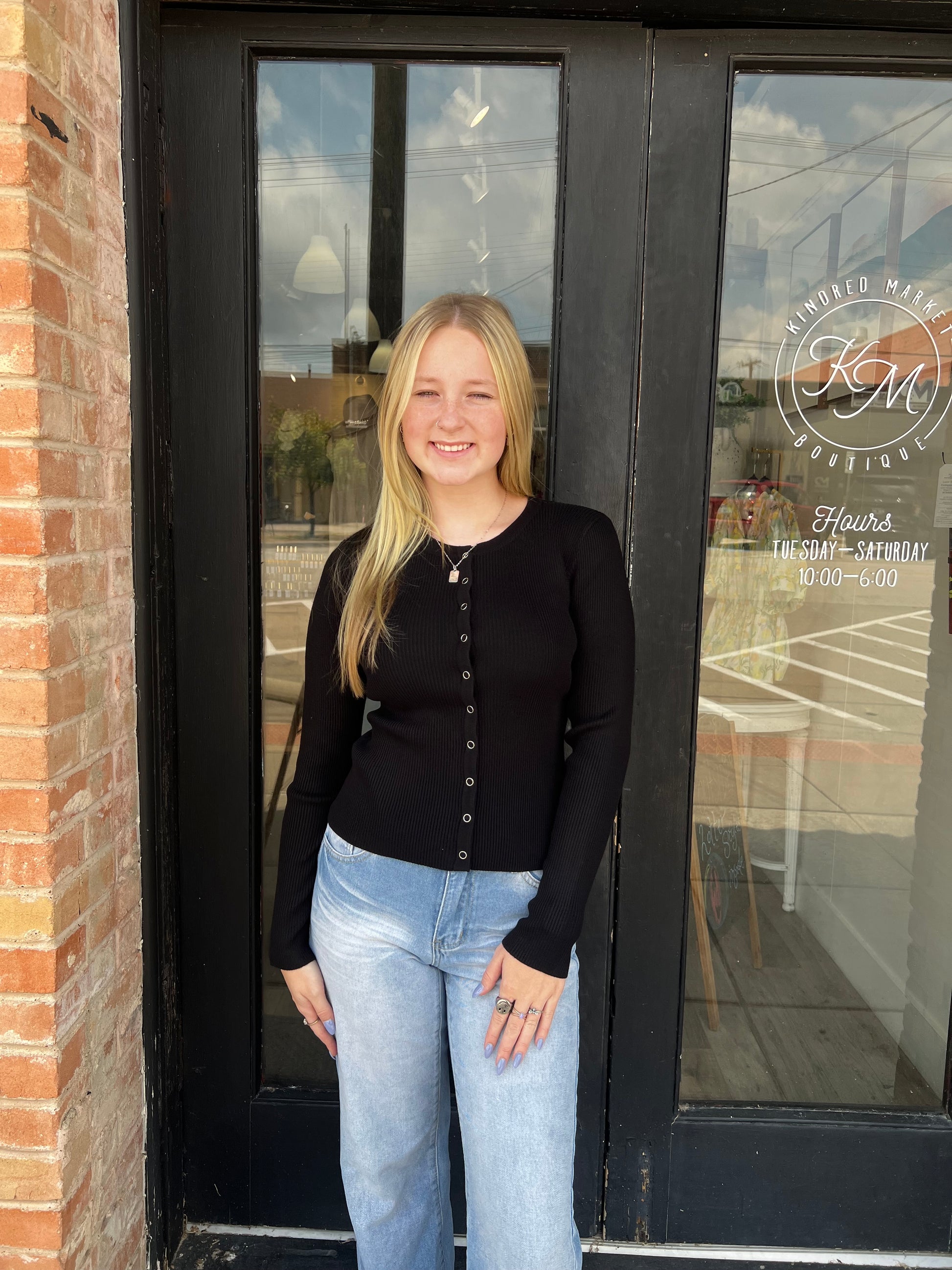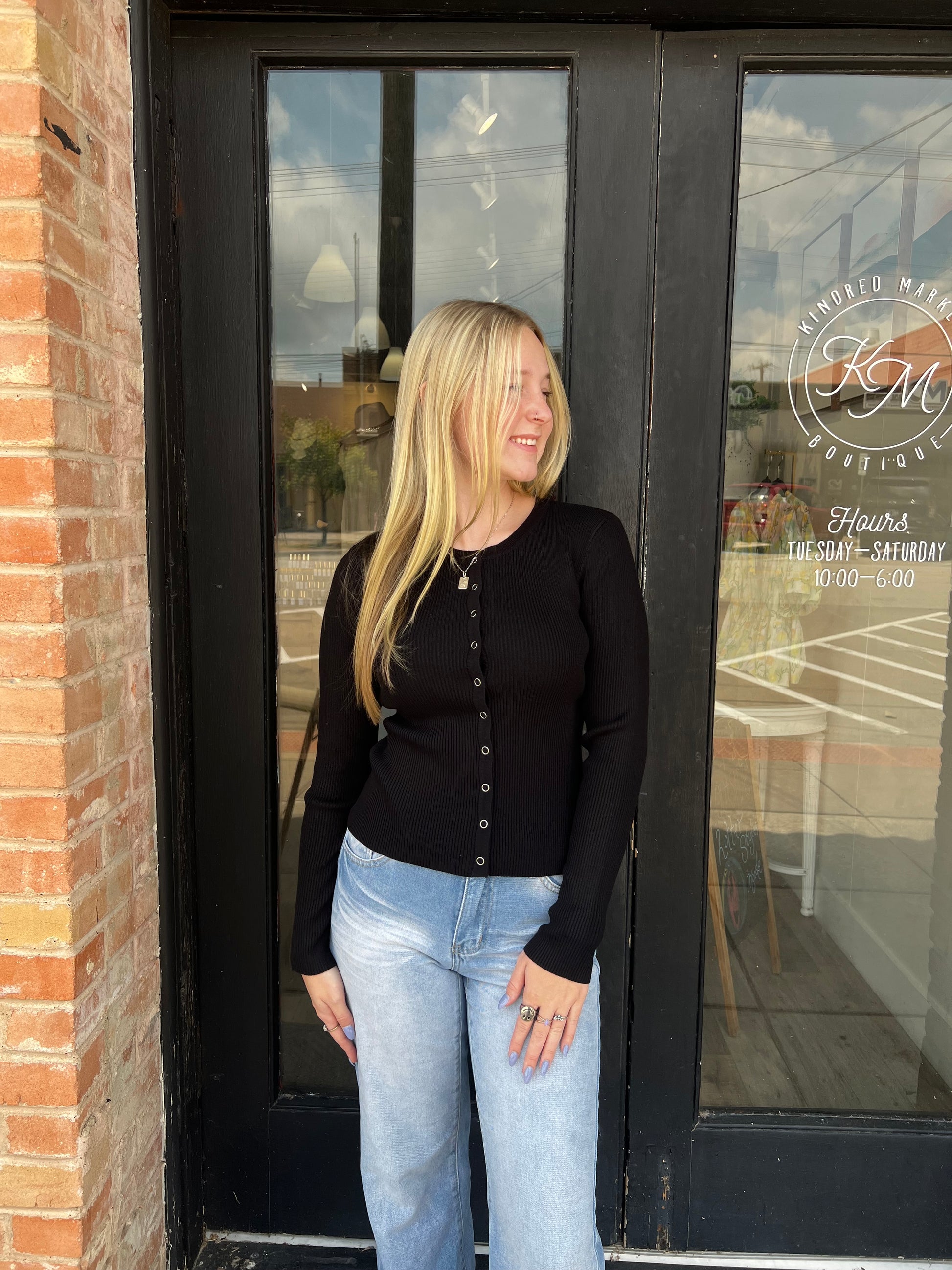 Elevate your wardrobe with the Astrid Black Ribbed Cardigan. Featuring a classic round neck and convenient snap buttons, this ribbed knit cardigan offers both style and ease. Its sleek black color pairs effortlessly with any outfit, making it a versatile layering piece for any season. Comfortable and chic, it’s perfect for adding a polished touch to your everyday look.
