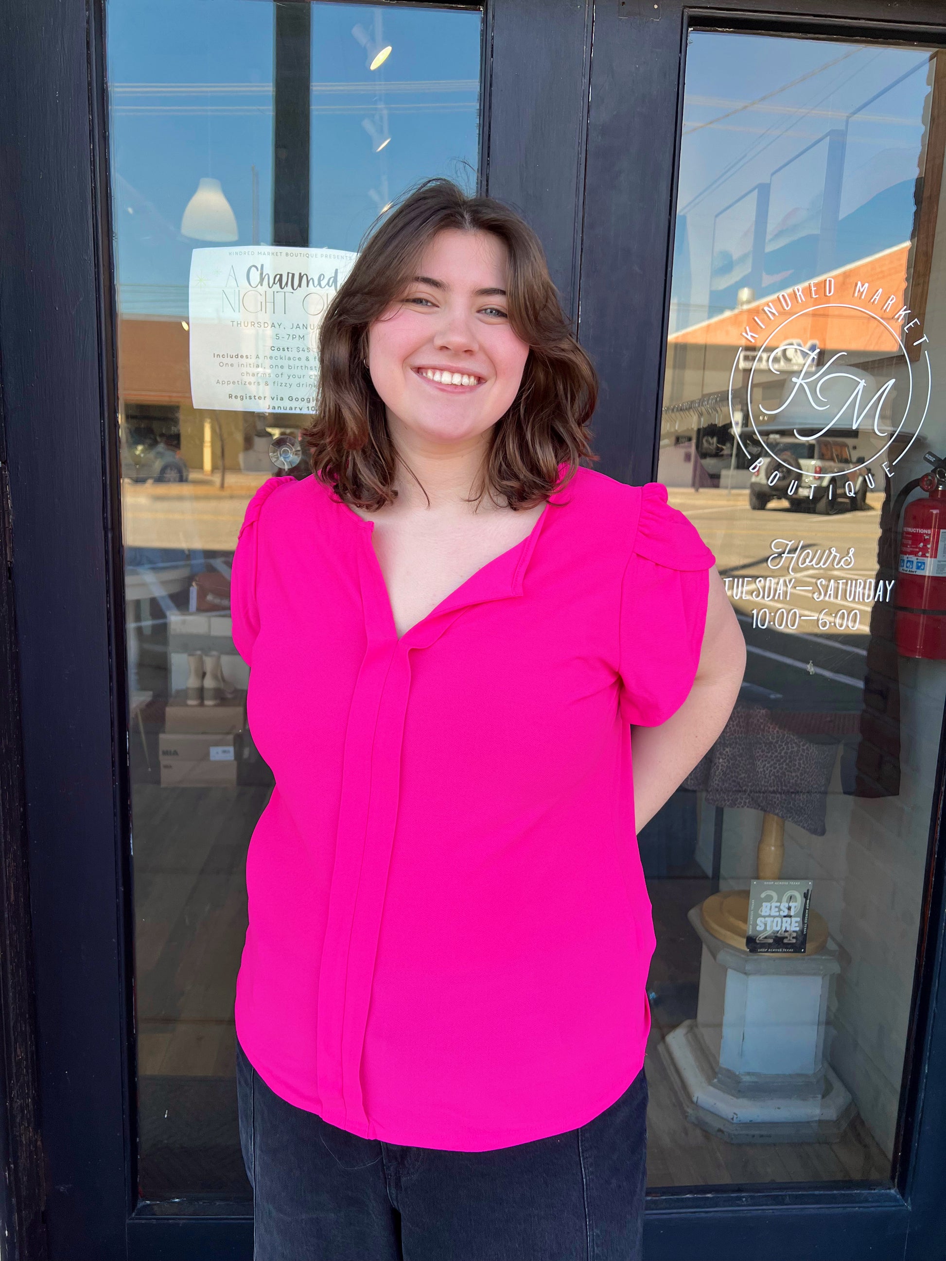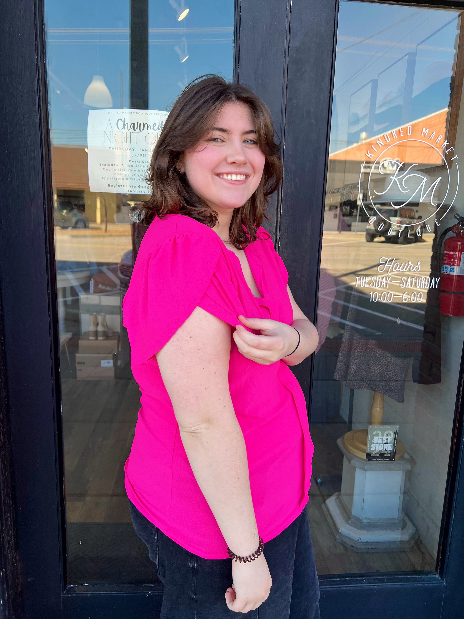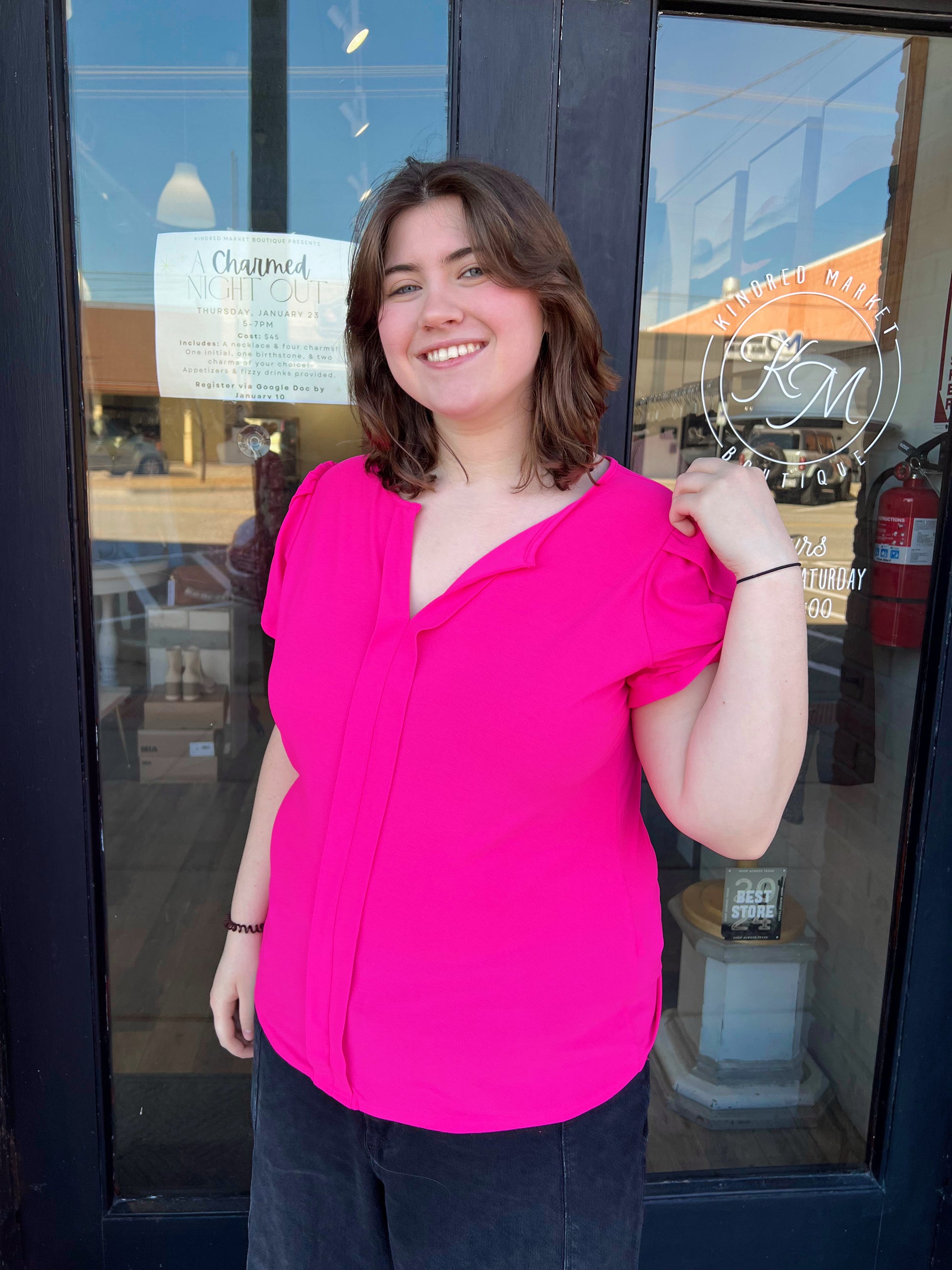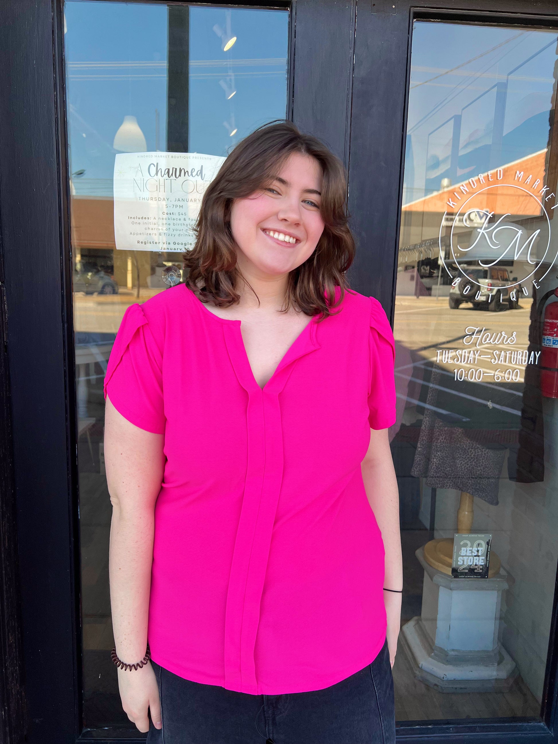 The Bonnie Plus Drape Sleeve Split Neck Top is a fuchsia split v neck line top with drape short sleeves. This is a solid unlined fitted top. The front under the neckline has a cute detail going down the top that adds a cute little detail. The perfect fun but basic everyday top. Pair this with a cute pair of your fav denim or leggings with a fun shacket over.