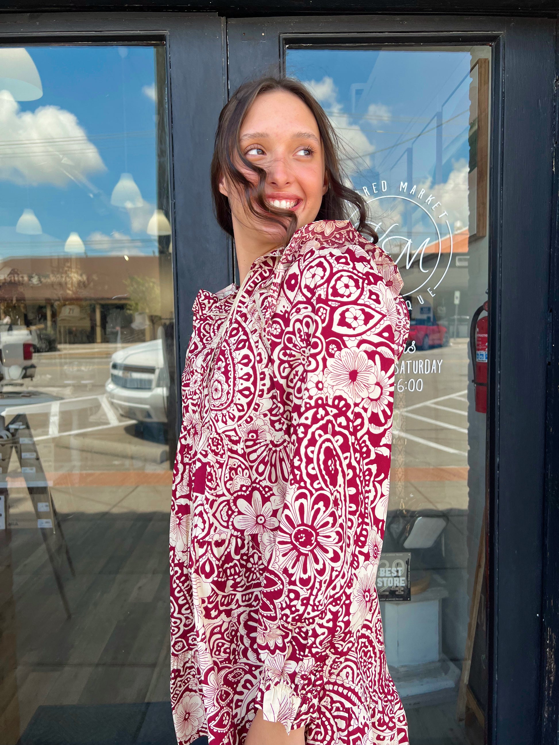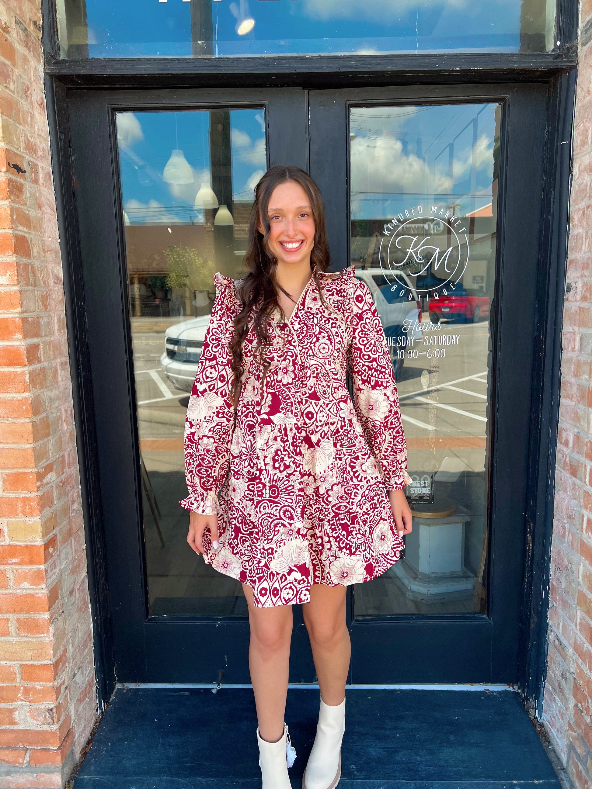 The Briar Burgundy Mix Long Sleeve Mini Dress is a beautiful tiered dress. The main creme color of the dress compliments the burgundy color so good! The perfect fall dress. There is a fun burgundy print on the dress with a collar with creme lining. There are ruffles on the shoulders and cuffs on the end of the sleeves. The long sleeves are good and thick but not too hot or cool.The material is made from 100% cotton. v neck line. Pair this with a super cute pair of fall booties or sandals.