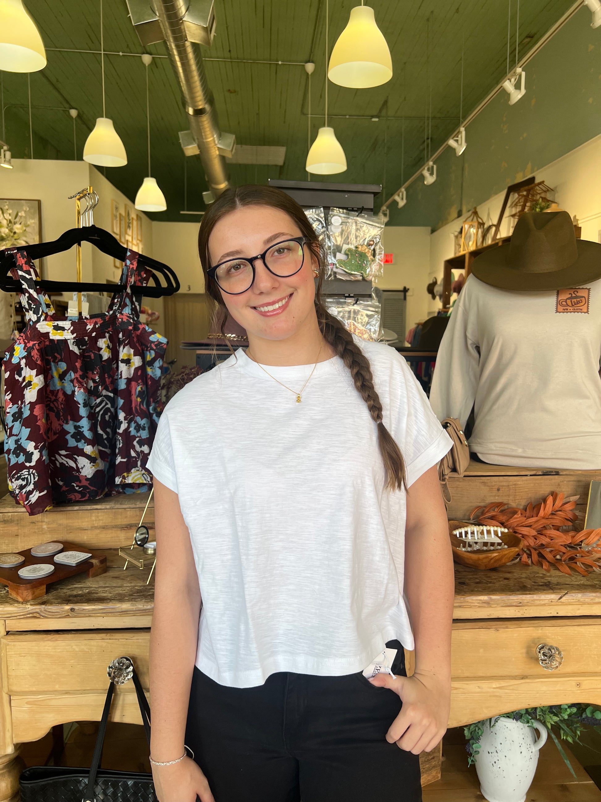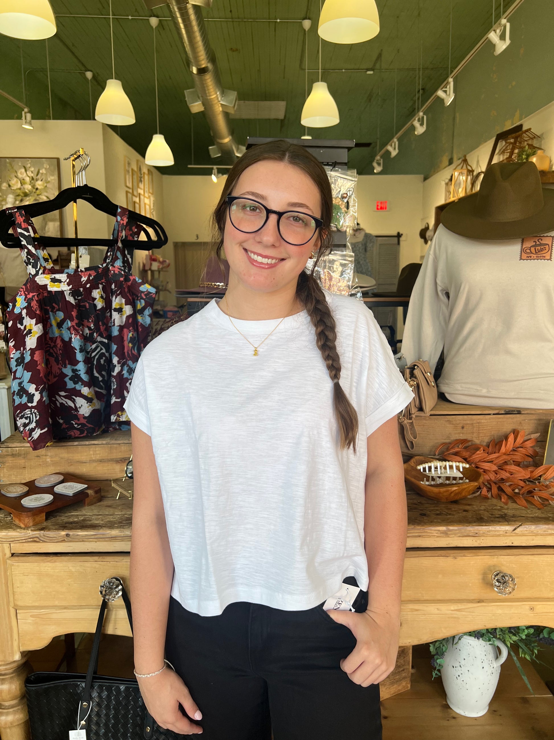 Elevate your everyday wardrobe with the Carly Basic White Tee. Featuring a slightly cropped fit, this versatile closet essential pairs effortlessly with high-waisted jeans or skirts for a modern, flattering silhouette. Crafted for comfort and style, it’s the perfect go-to top that balances simplicity with a subtle edge. Make it your new favorite layering piece or wear it on its own for an effortlessly chic look.