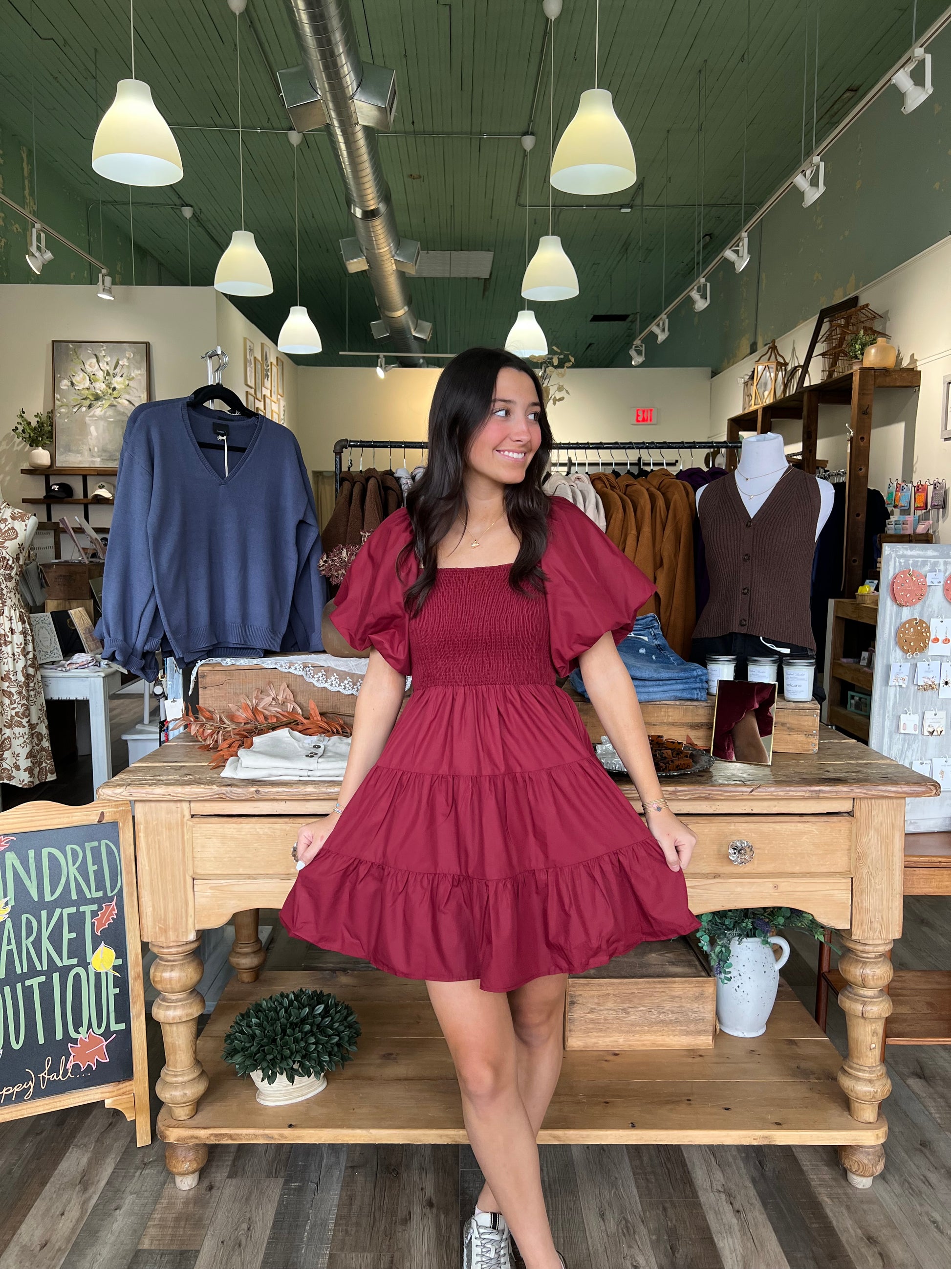 Embrace effortless style with the Dahlia Red Tiered Mini Dress. Featuring a smocked top and playful puff sleeves, this dress offers a comfortable, flattering fit. The tiered skirt adds movement and charm, perfect for day-to-night wear. Its vibrant red hue ensures you stand out with confidence wherever you go.