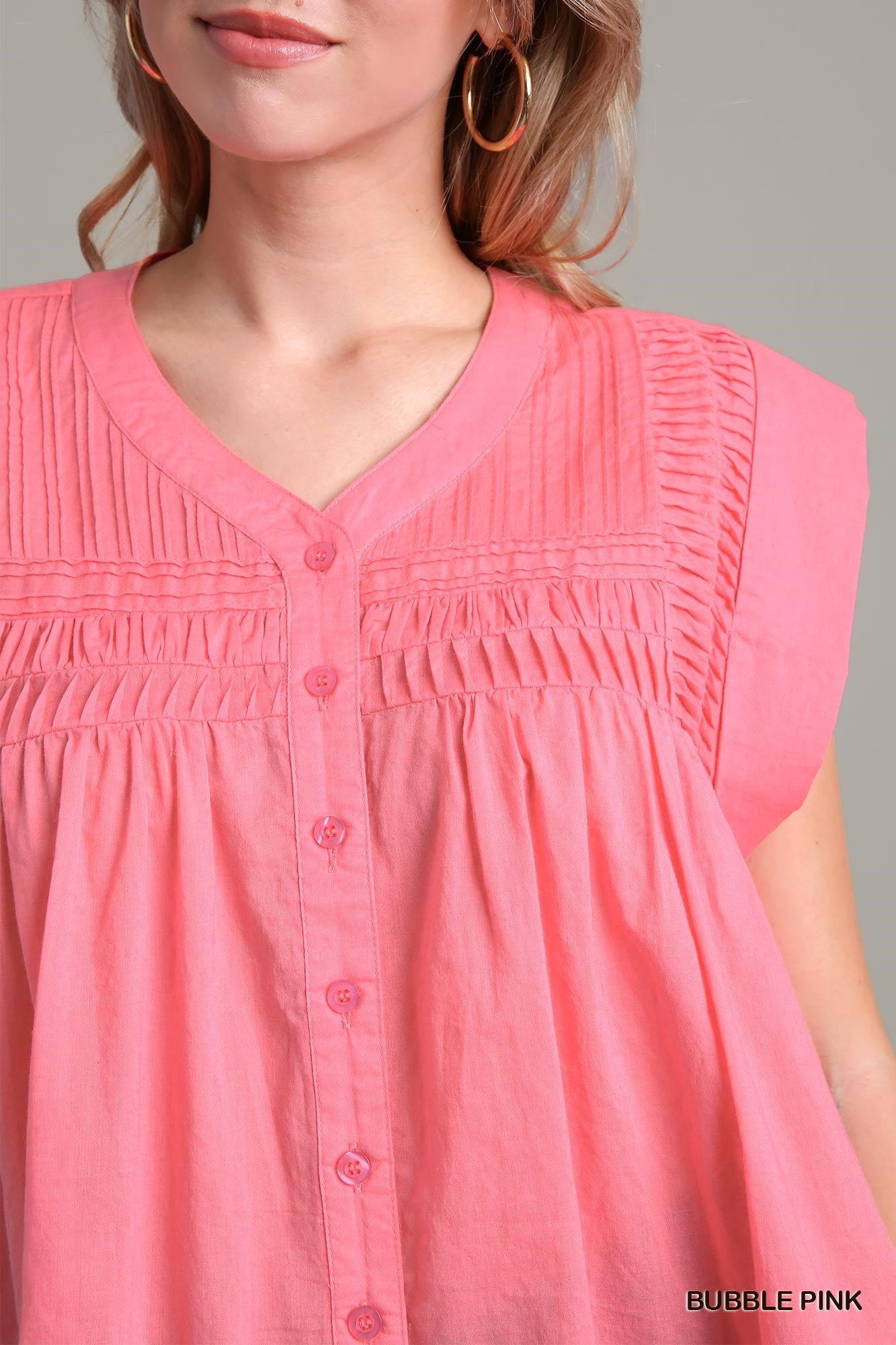 Elevate your wardrobe with the Daniella Bubble Pink Decorative Top. Featuring a flattering v-neck and charming button-down front, this top is enhanced by delicate pintuck details that add a touch of elegance. Its soft bubble pink hue brings a fresh, feminine vibe, making it perfect for both casual outings and dressier occasions. Experience comfort and style effortlessly combined in one versatile piece.