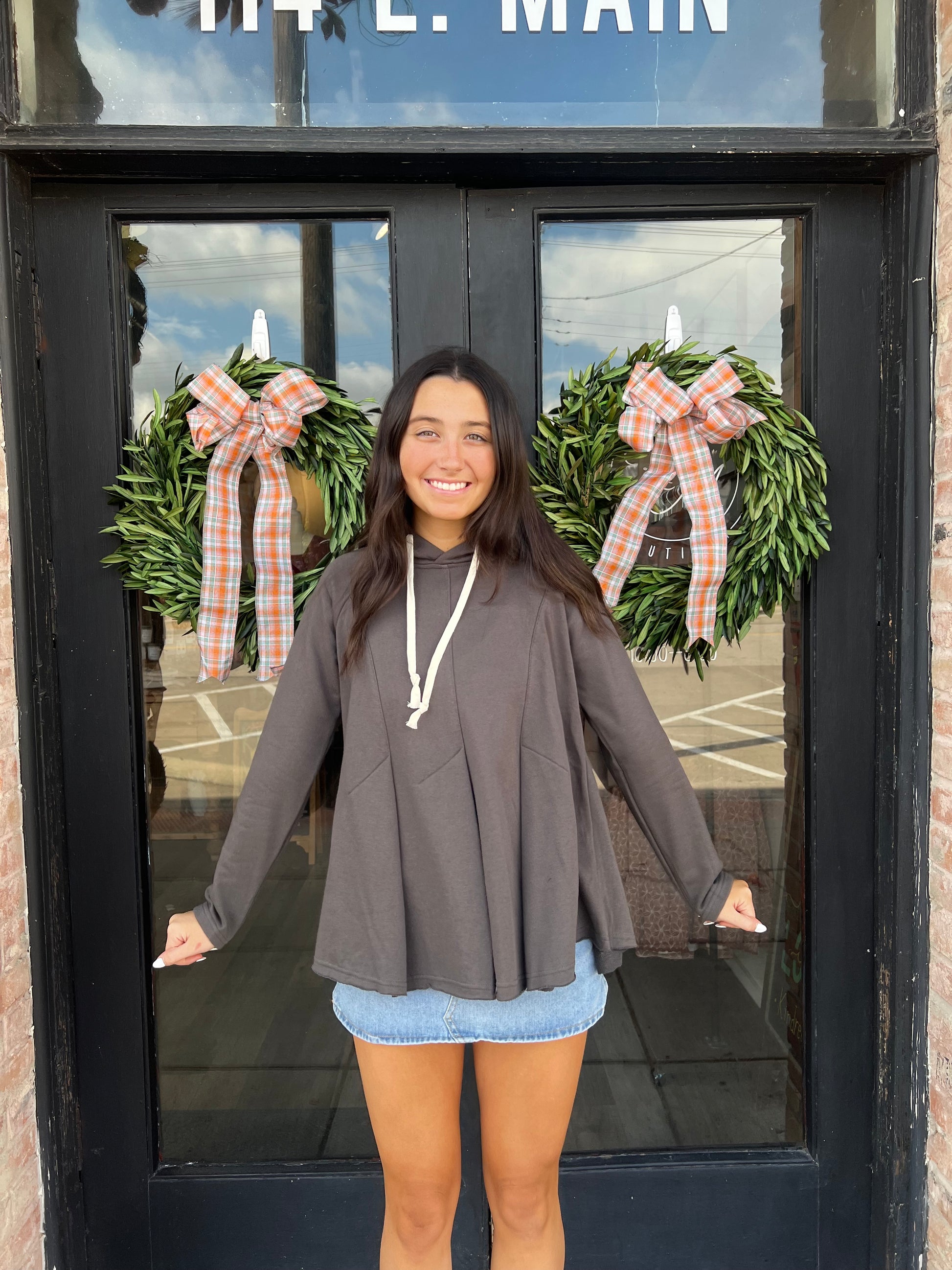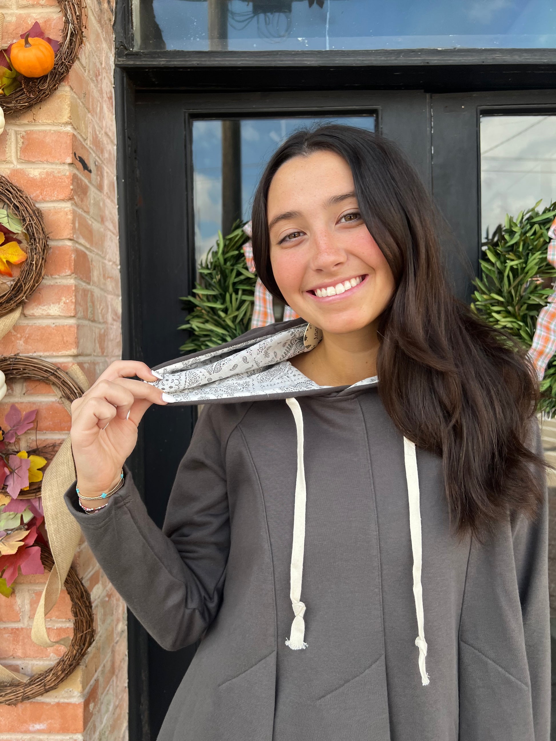 Elevate your casual wardrobe with the Dorcas Charcoal Pleated Hoodie. Its rich charcoal gray hue and stylish pleated design offer a unique texture and modern edge. The hood features a subtle bandana pattern, adding a distinctive flair, while adjustable drawstrings ensure a perfect fit. Perfect for layering, this hoodie combines comfort and standout style effortlessly.
