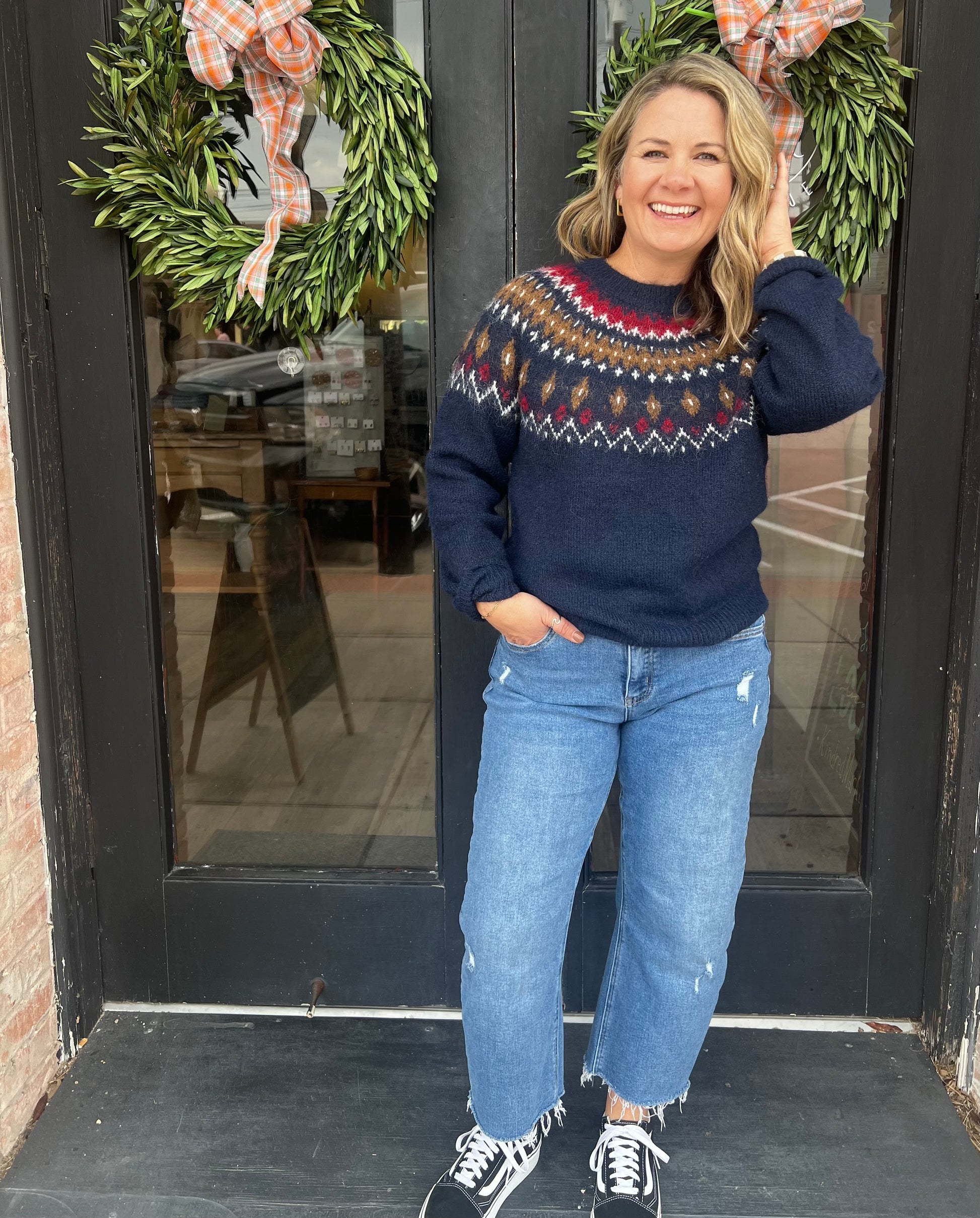 Stay cozy and stylish with the Kate Fuzzy Fair Isle Crew Neck Pullover Sweater. Crafted from super soft, fuzzy fabric, this sweater offers warmth and comfort without sacrificing cuteness. Its classic crew neck and charming Fair Isle pattern make it the perfect layering piece for chilly days, effortlessly elevating your casual wardrobe with a touch of timeless charm.