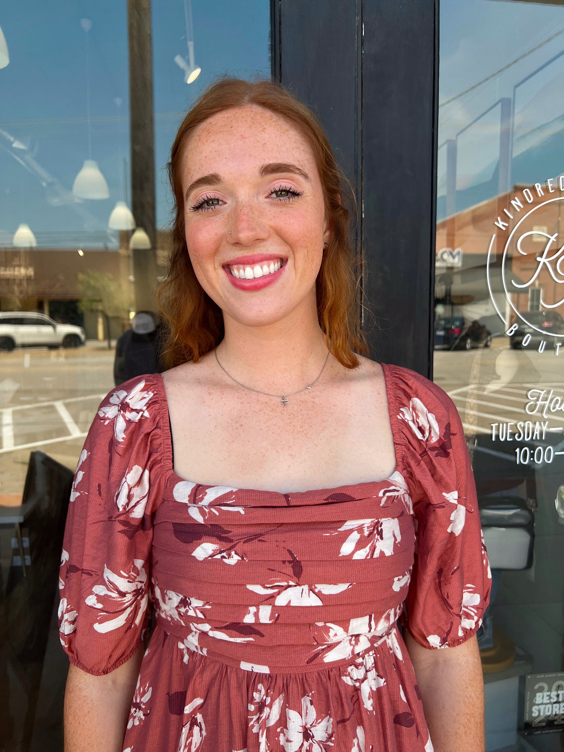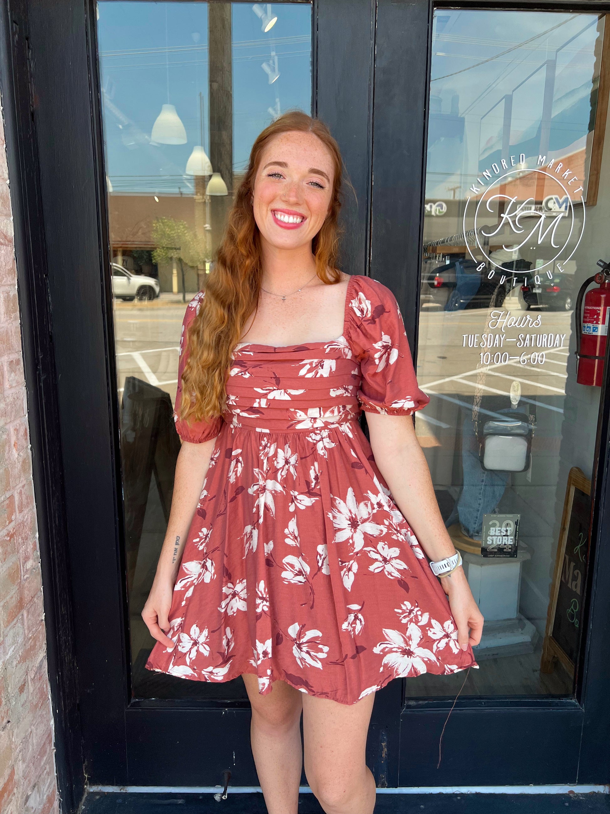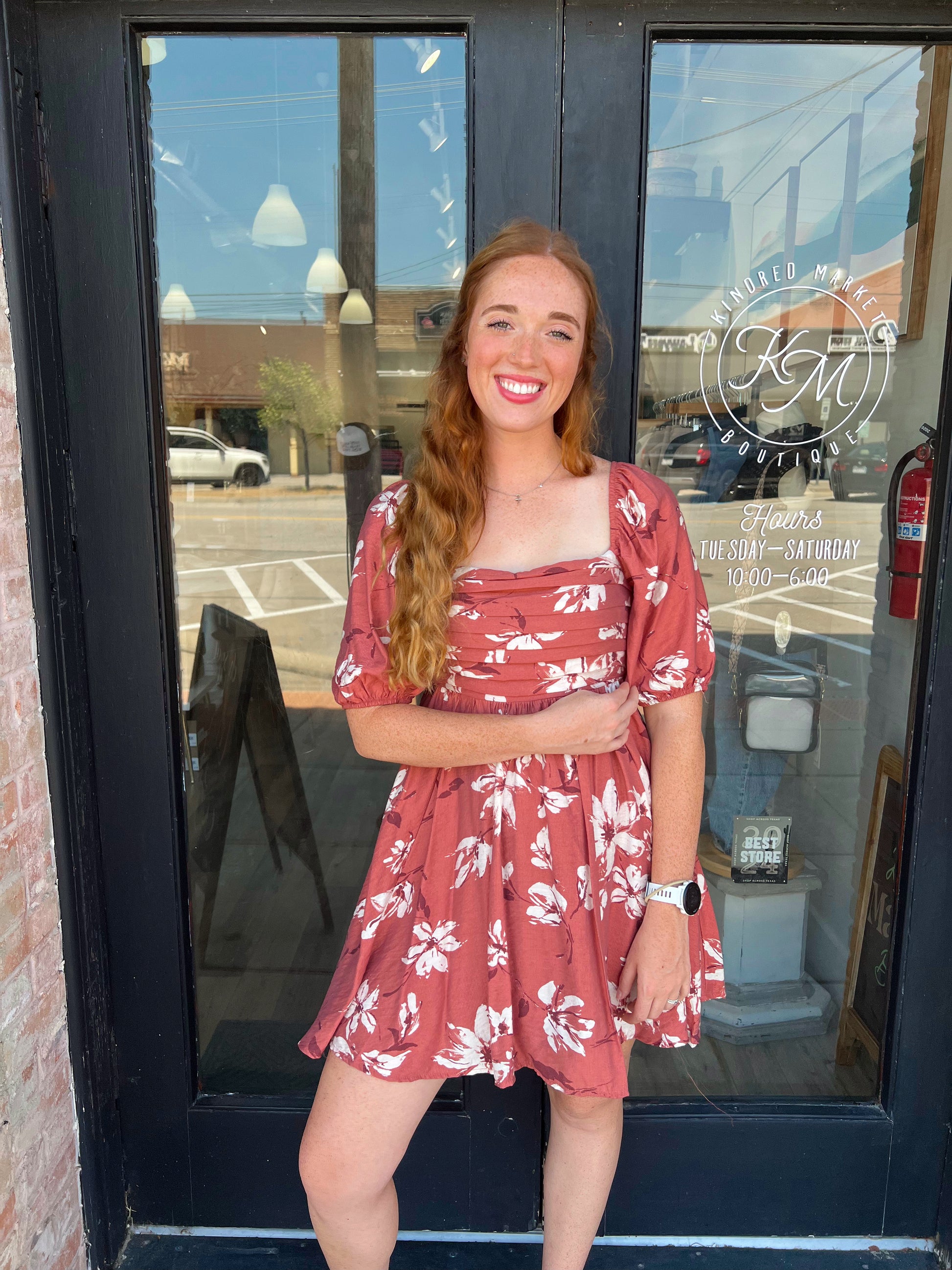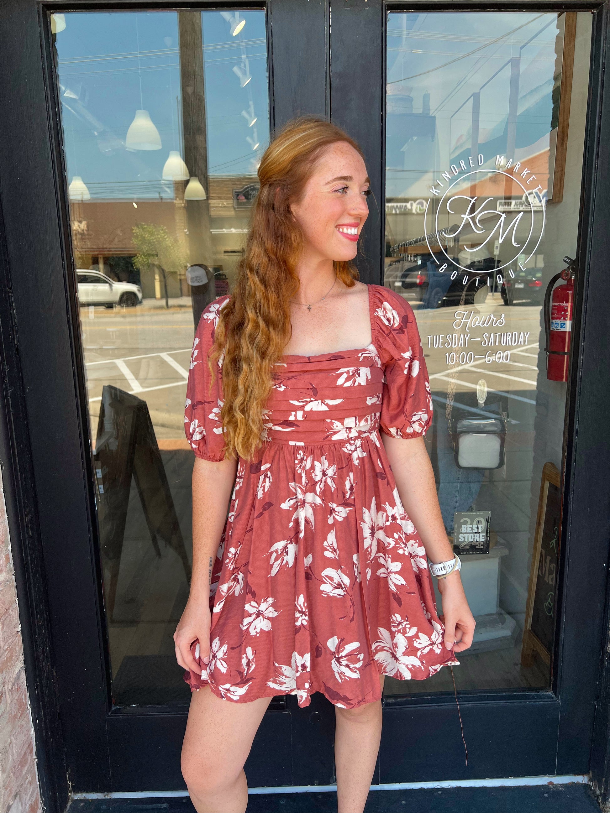 The Goldie Floral Pleated Puff Sleeve Mini Dress is the image of the perfect fall dress. The terracotta color and the florals are just perfect together. The top of the dress is pleated which just adds so much flattery. The puff sleeves are super comfortable and stylish. The dress is very lightweight and flattering but not see through. The material is made from 80% rayon and 20% nylon. Pair this with some super cute booties and a fall hat.