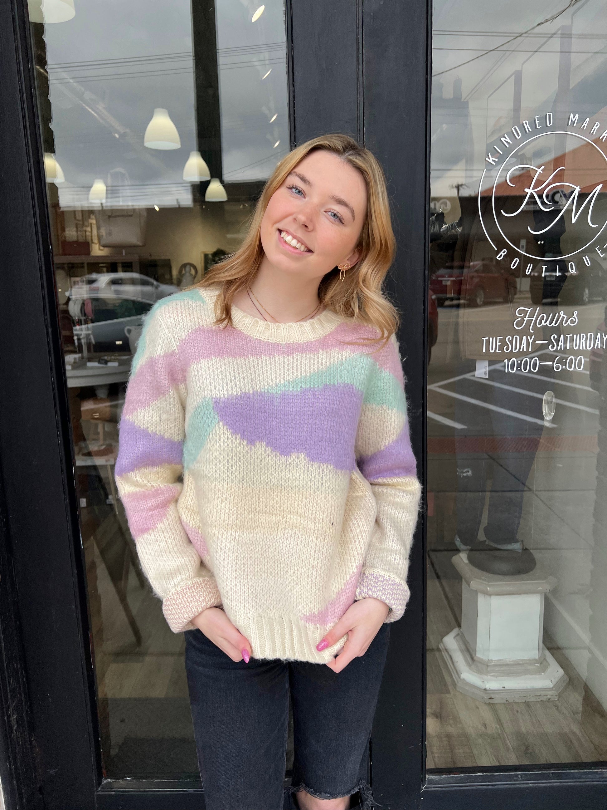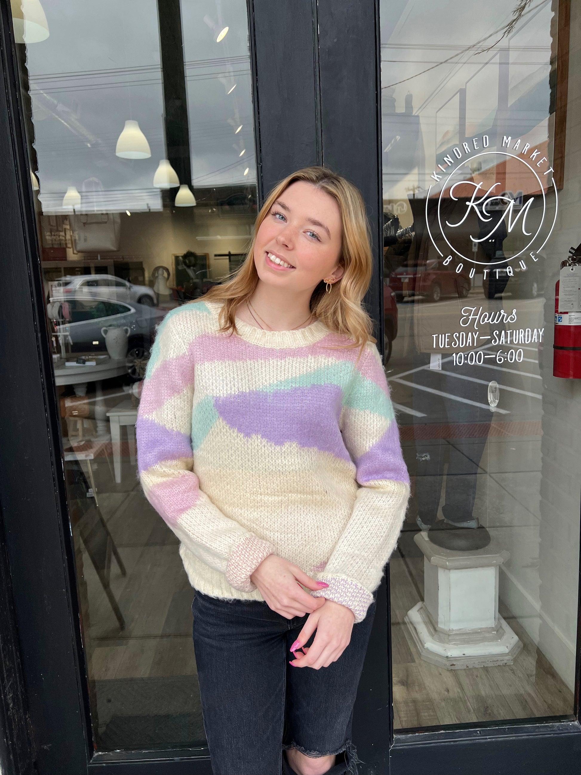 This ivory sweater is stunning. The blues and purples are a great accent towards the ivory base of the sweater. The round neckline is flattering on everyone and this sweater is a great addition to your wardrobe!