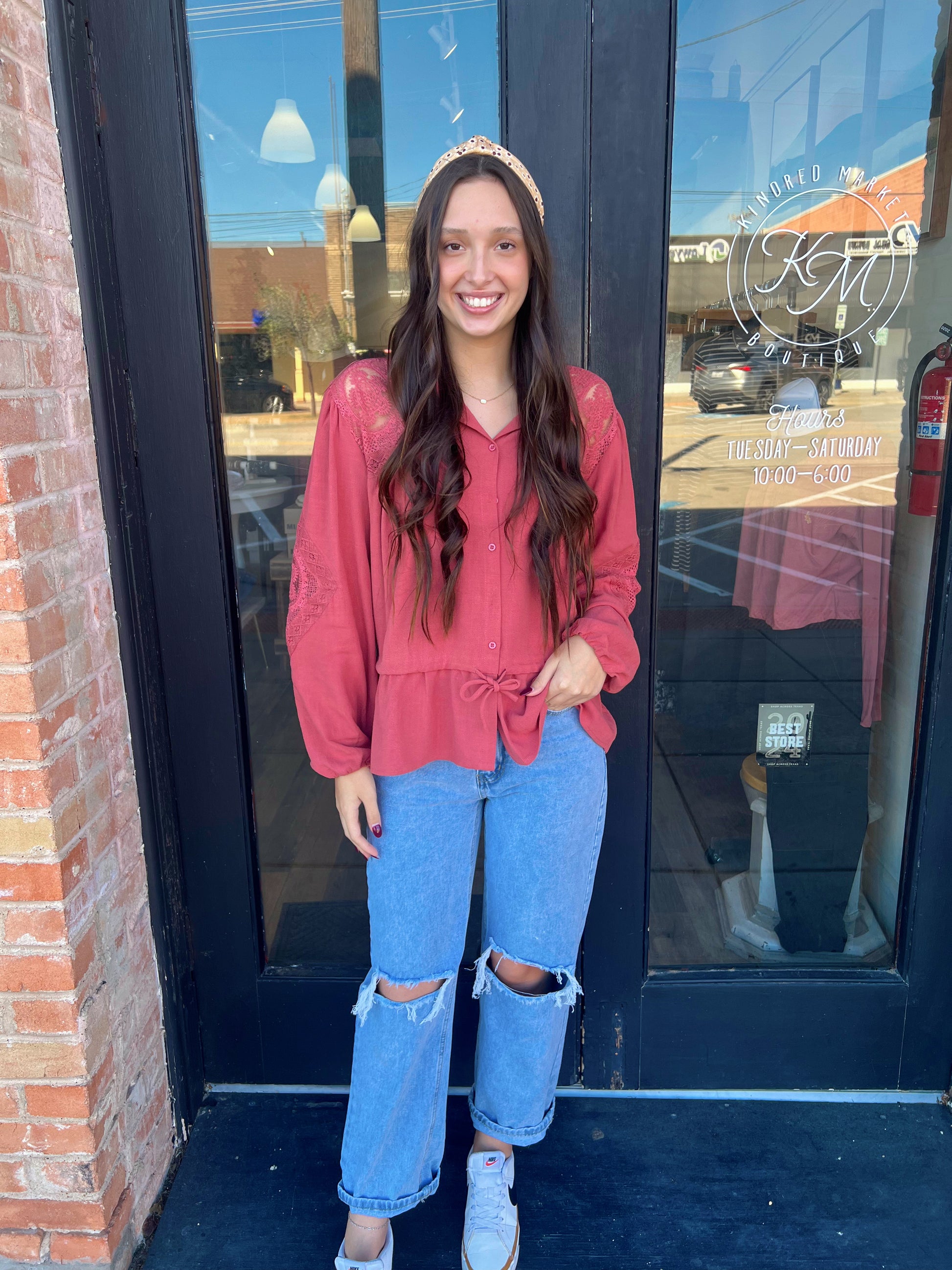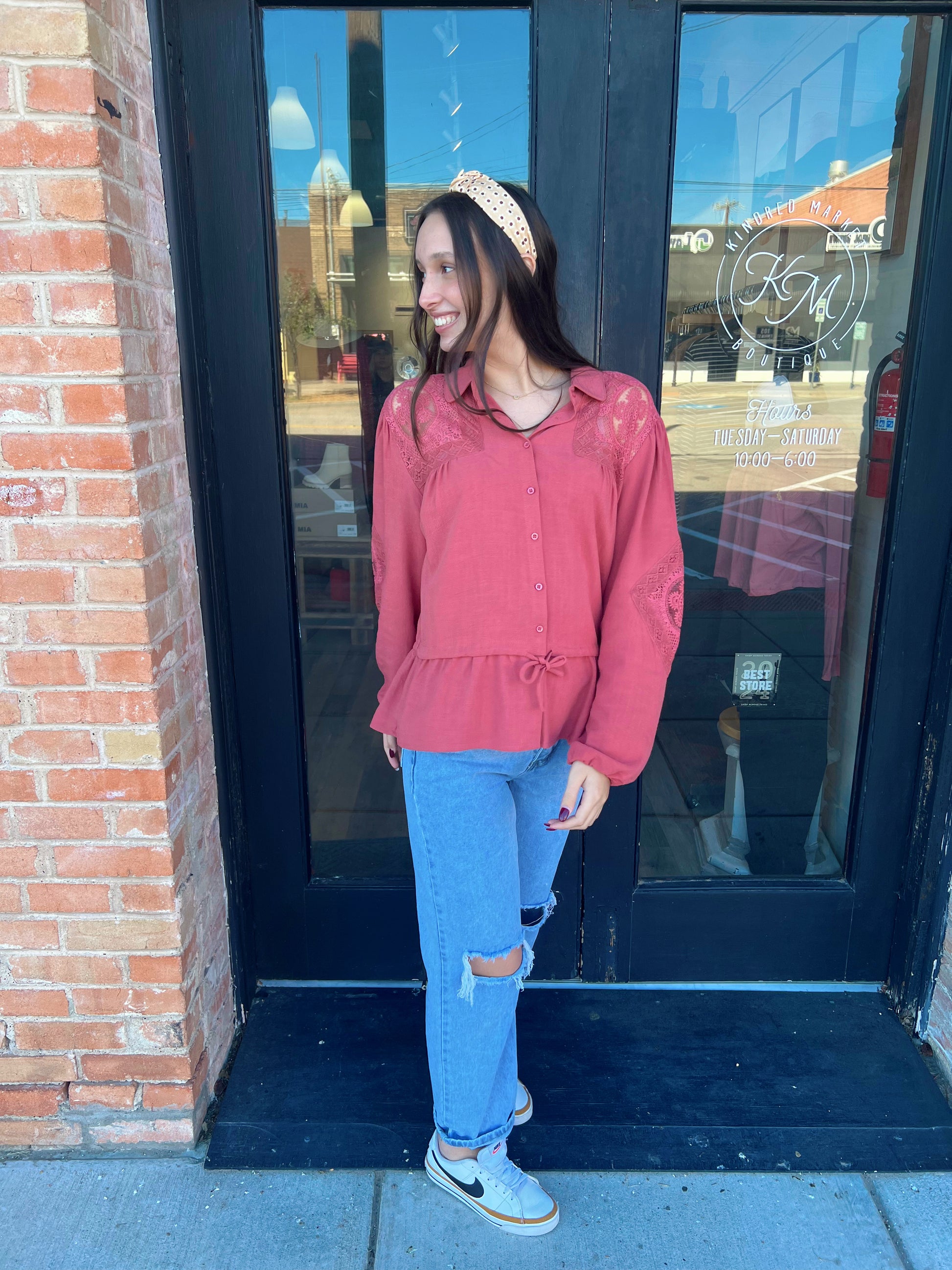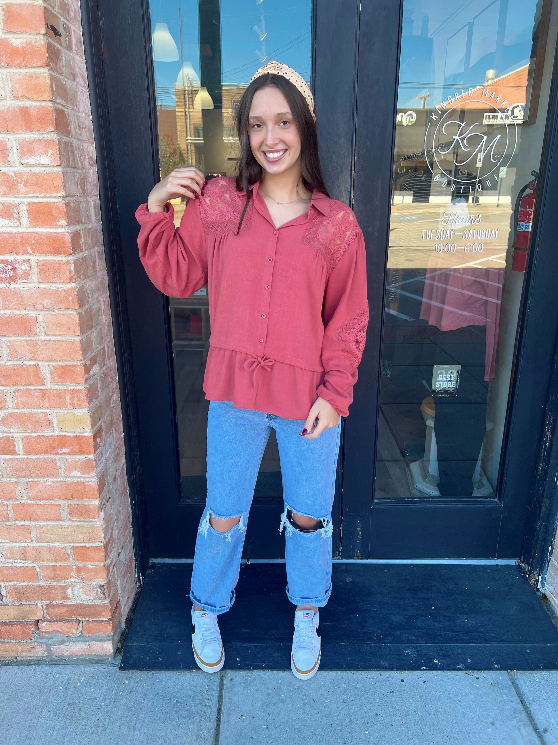 The Imogen Lace Rose Blouse is a button up shirt with a ruffle layer at the hem. It has lace details on the shoulders and elbows. It has elastic on the wrists of the sleeve and a tie around the waist. It is made of 55% linen and 45% cotton. This top can easily be dressed up or down. It would pair great with light colored slacks!