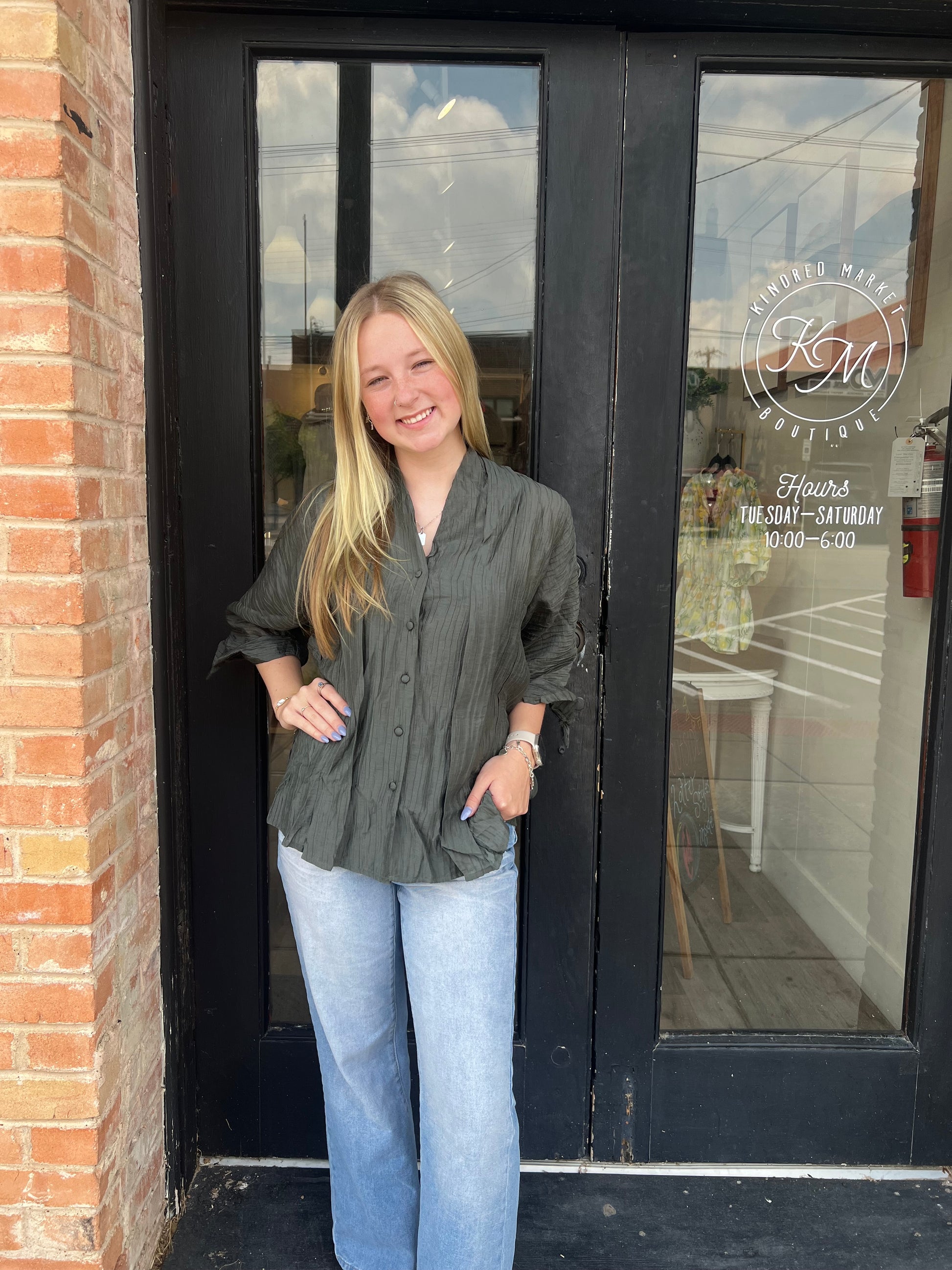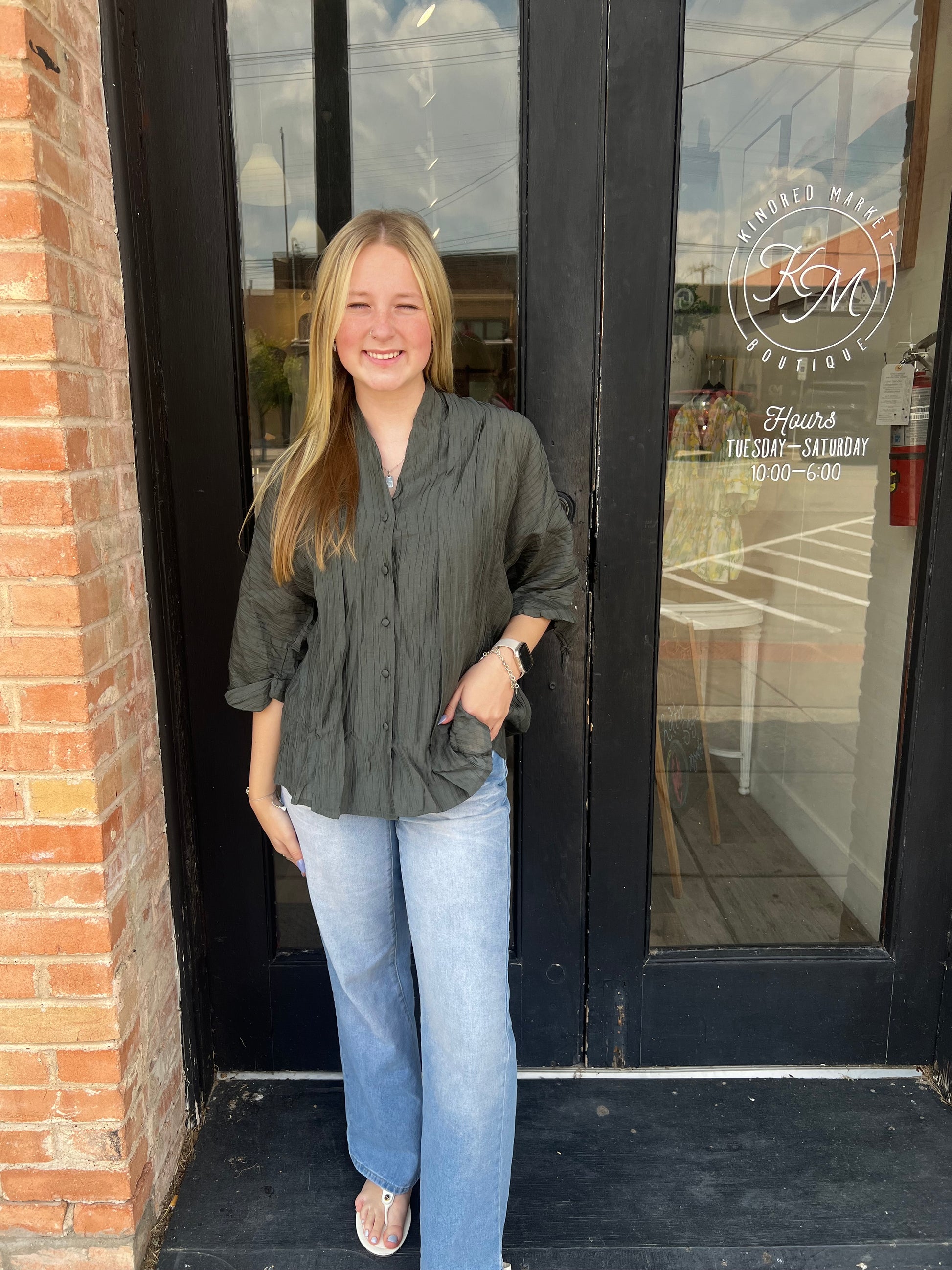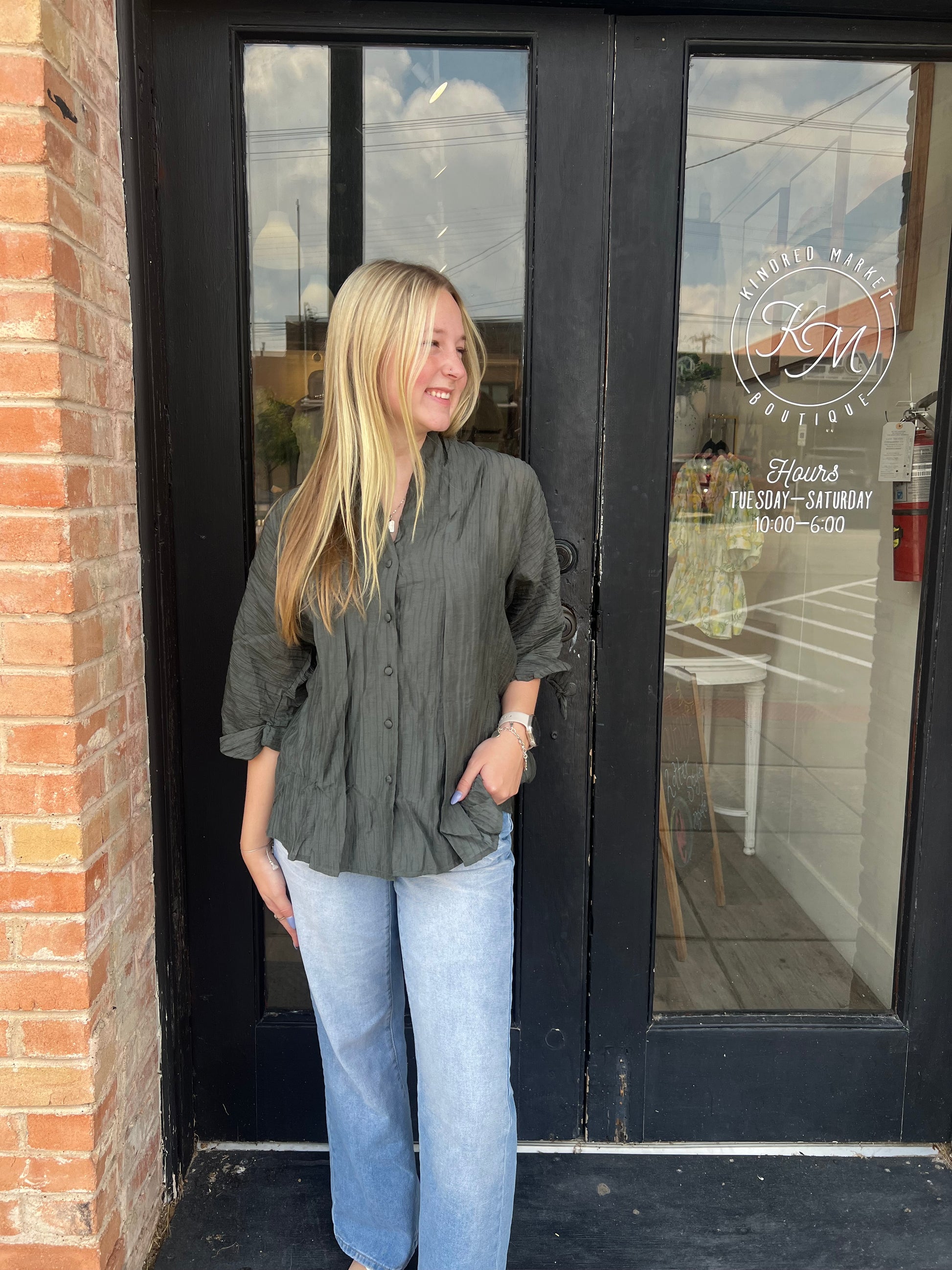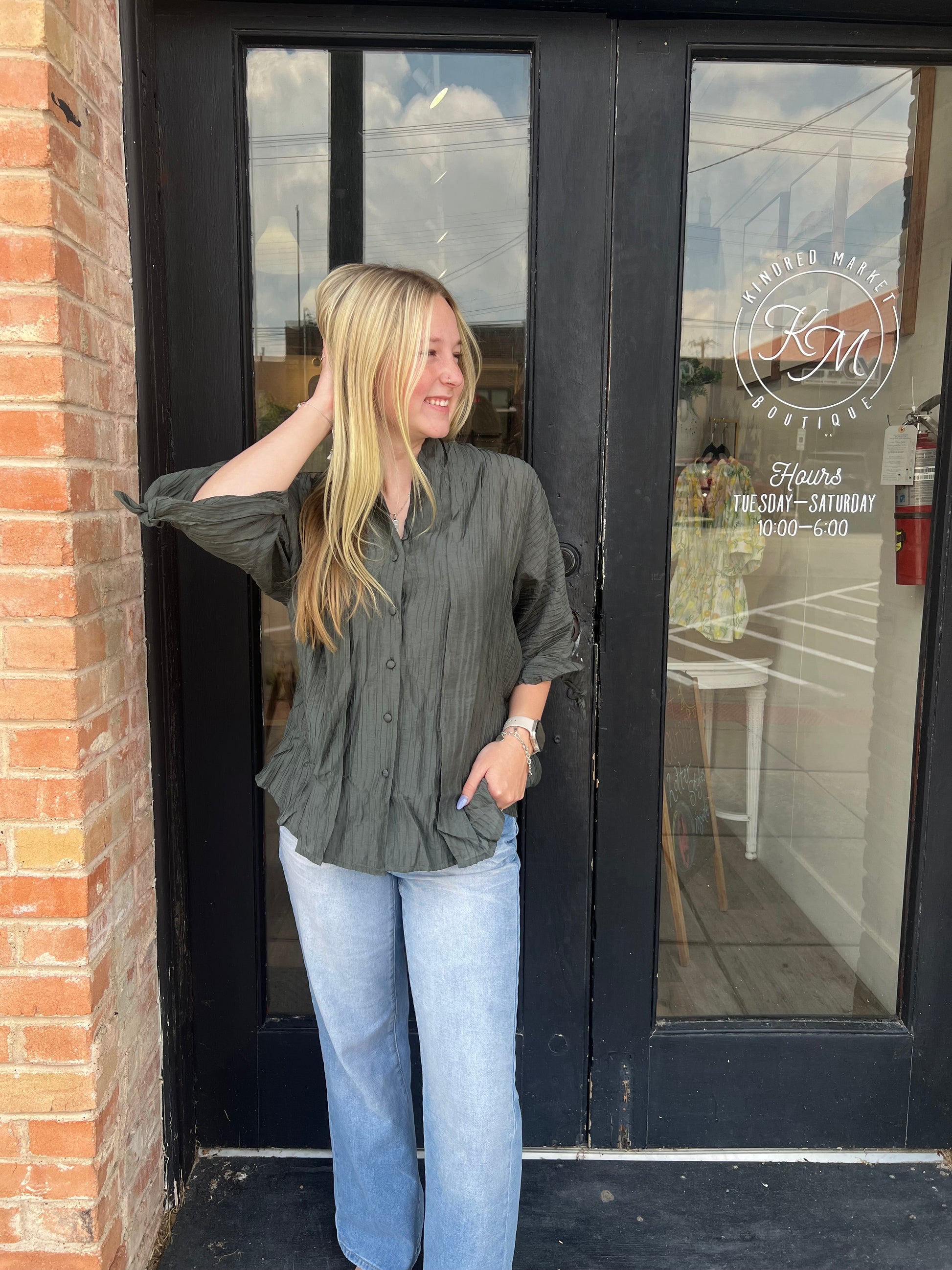 Elevate your wardrobe with the Jade Seaweed Pleated Top, crafted from lightweight crinkle fabric that adds effortless texture and charm. Featuring a stylish crinkled collar and delicate pleated details, this top offers a refined yet relaxed look. The functional belt allows you to customize the fit, enhancing your silhouette with ease. Perfect for both casual outings and polished occasions, this versatile piece combines comfort and sophistication in one flattering design.