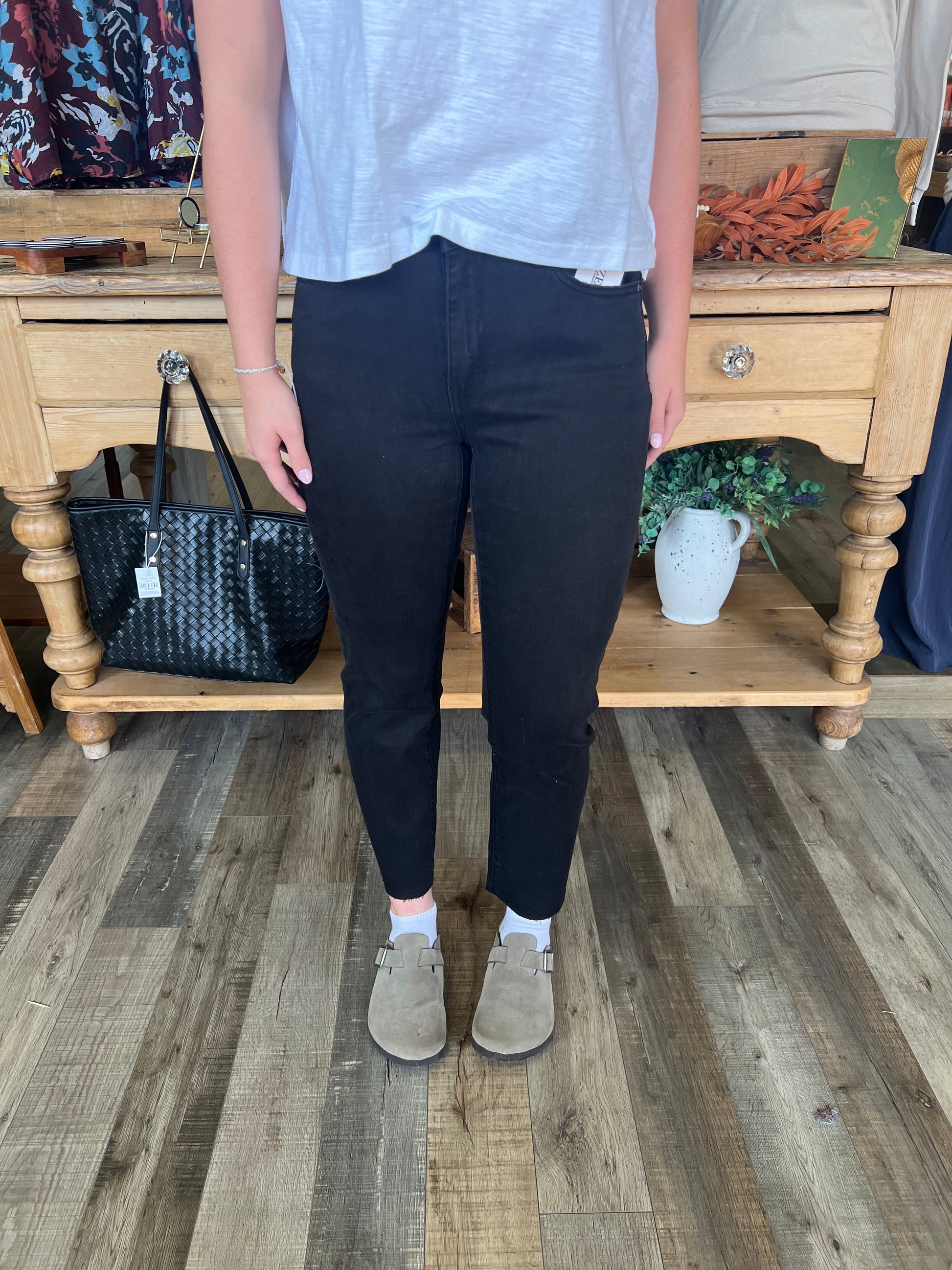 Elevate your wardrobe with the Jordan Black Straight Leg Jeans. Crafted from sleek black denim, these jeans feature a trendy frayed hem and a flattering straight leg cut that complements any body shape. Perfect for casual outings or effortlessly chic looks, they combine comfort and style in one versatile piece.