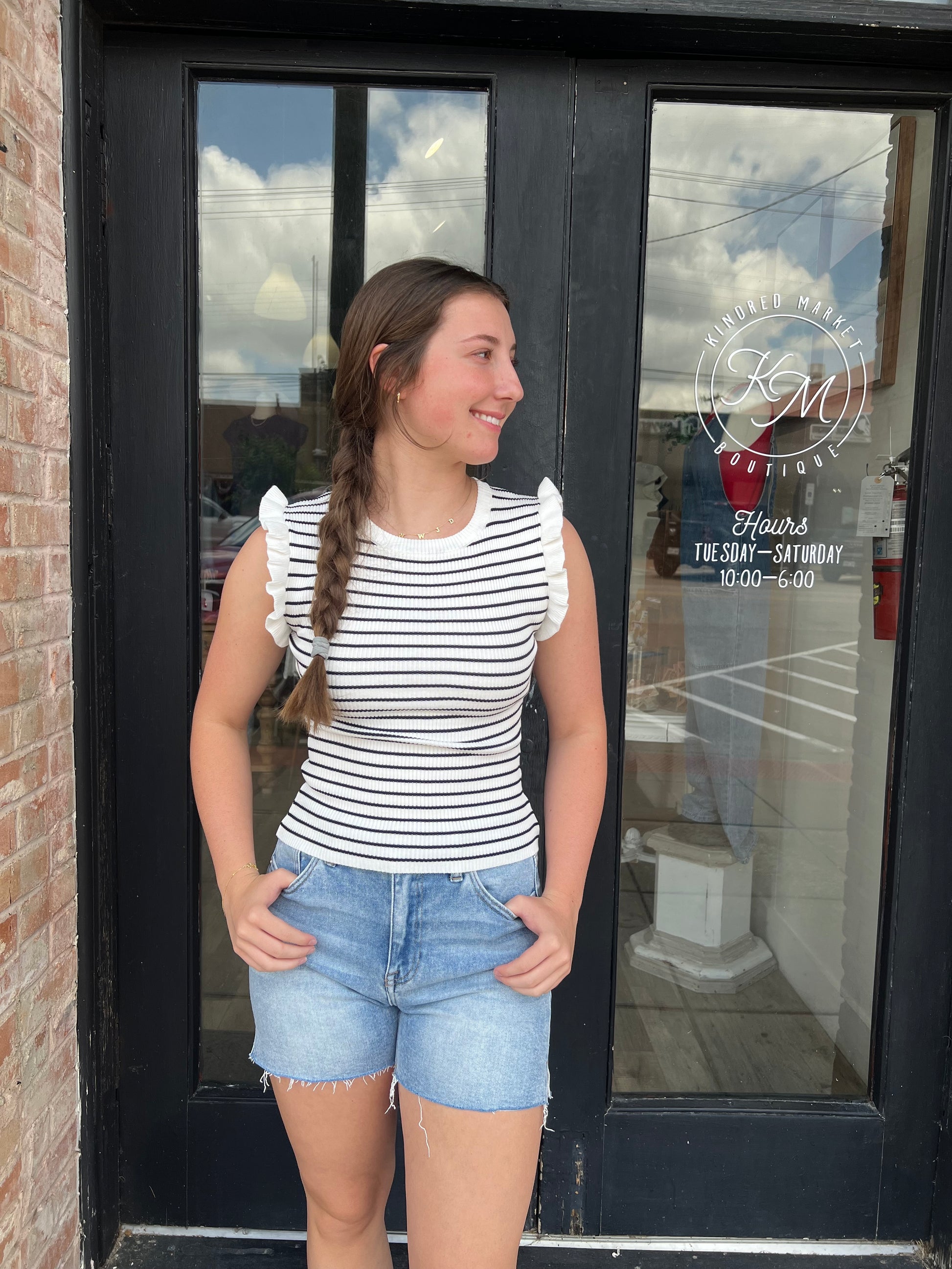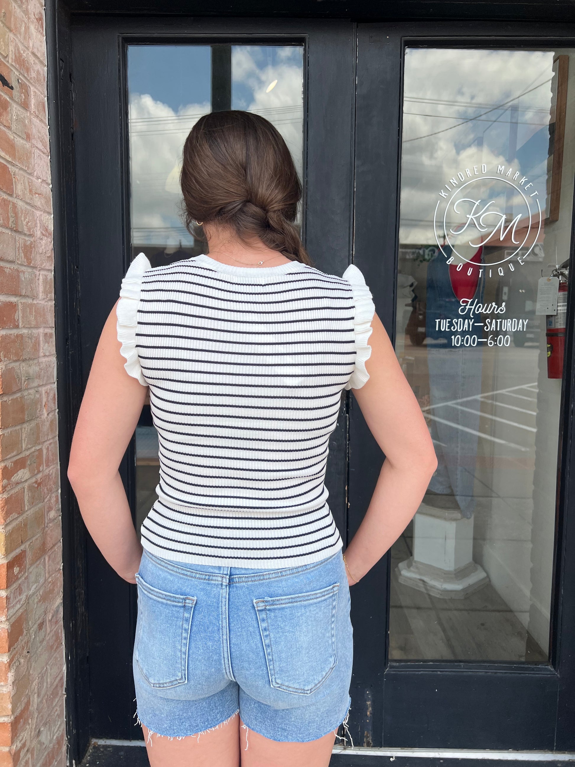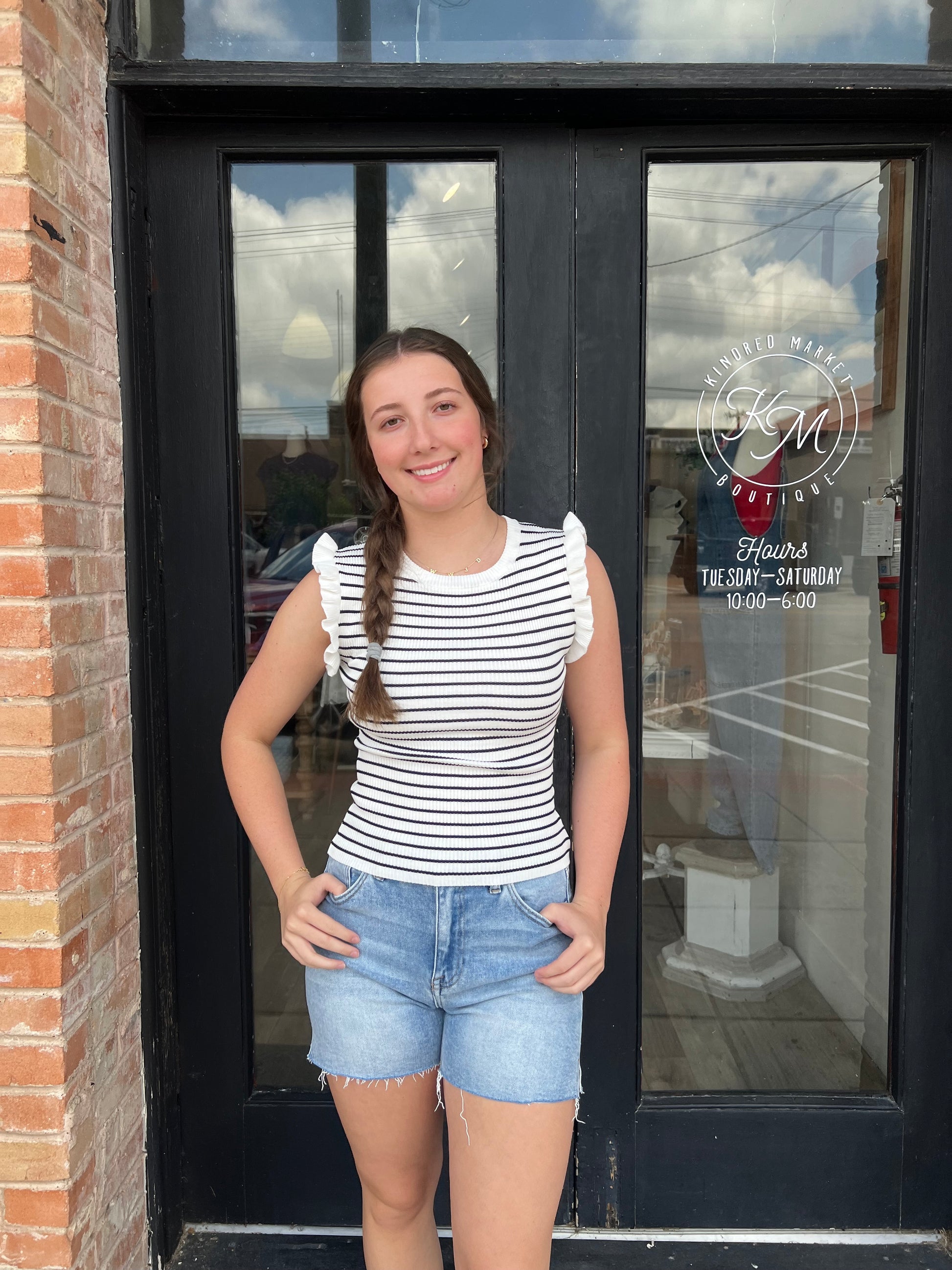 Elevate your wardrobe with the Kris Stripe Ruffle Trim Tank Top. Featuring classic navy and white stripes, this sleeveless sweater combines timeless style with a playful ruffle trim for a feminine touch. Perfect for layering or wearing on its own, it offers both comfort and chic versatility for any occasion.