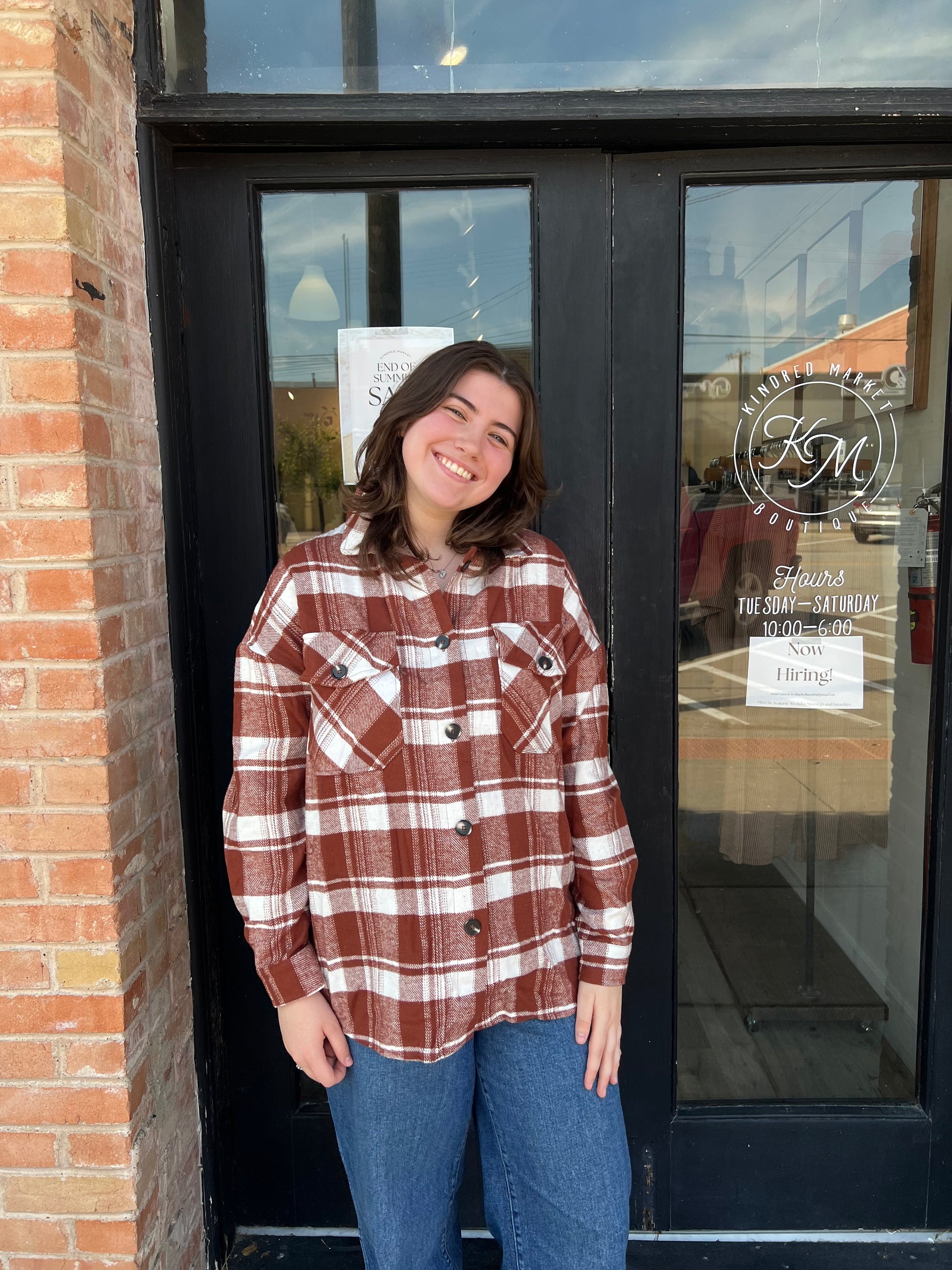 The Layla Clay Flannel Shacket blends cozy warmth with bold style. Its oversized fit and soft clay-orange plaid create a relaxed yet eye-catching look, perfect for layering on cooler days. Crafted from plush flannel, this shirt jacket offers both comfort and durability, making it an ideal choice for versatile, everyday wear. Elevate your casual wardrobe with this effortless staple that pairs well with jeans or leggings for a laid-back, trendy vibe.