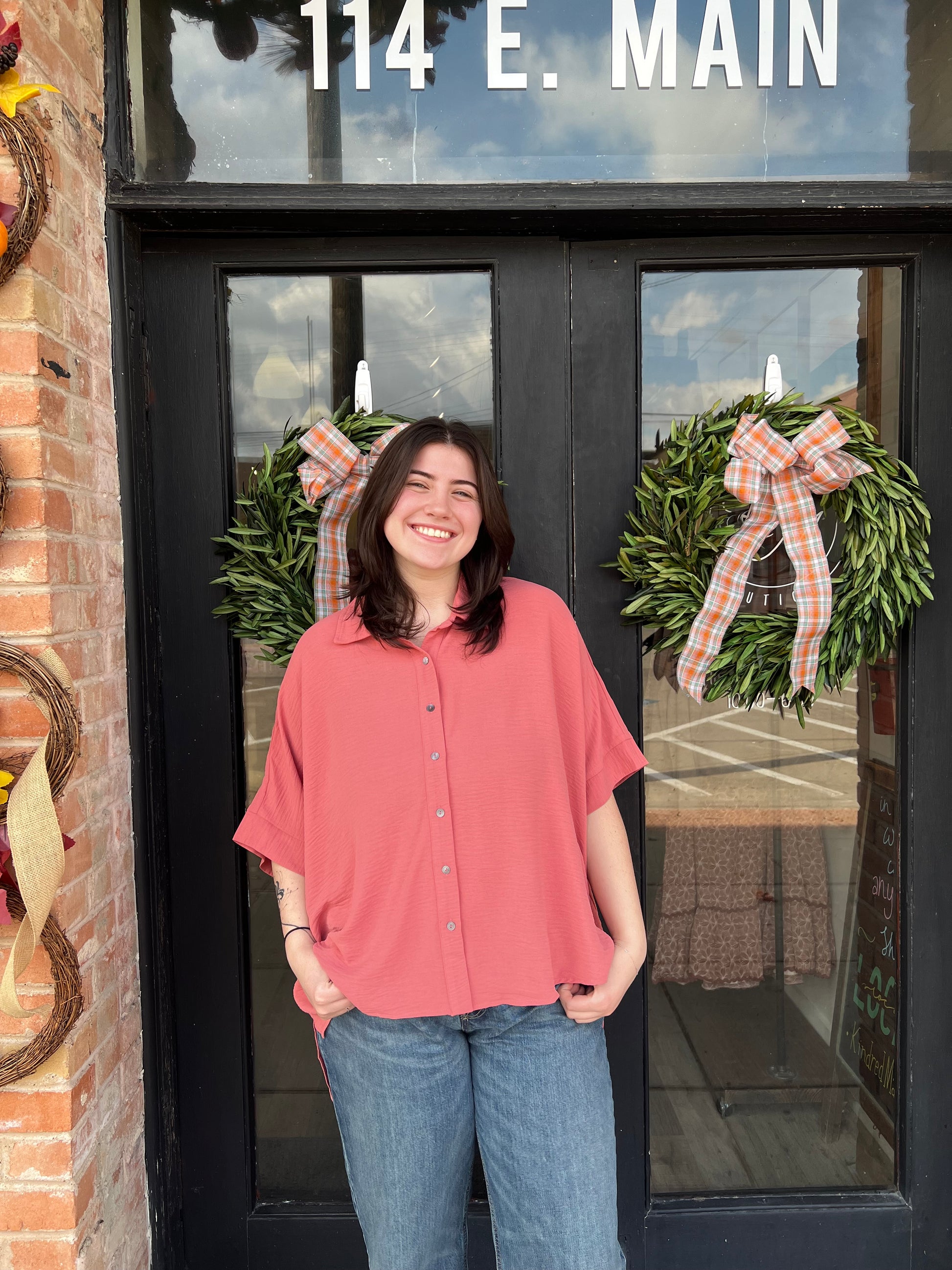 Elevate your wardrobe with the Lily Terracotta Button Down. Featuring a warm terracotta hue, this shirt combines style and comfort with its relaxed drop sleeves and classic collar. The front button-down design adds effortless sophistication, making it perfect for both casual outings and polished looks. Embrace a versatile piece that complements any outfit with ease.
