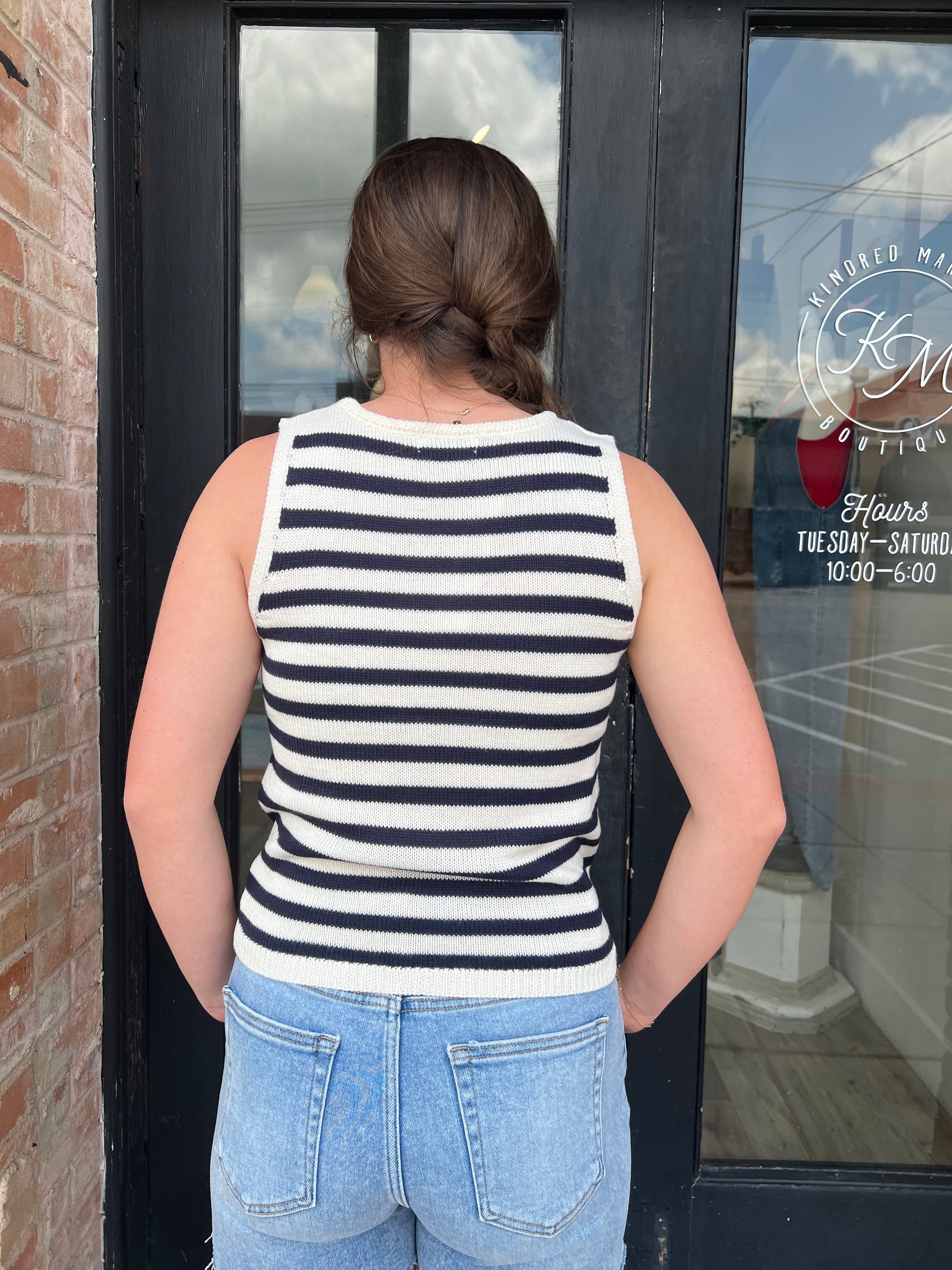 Elevate your casual wardrobe with the Lina Stripe Sweater Tank Top. Featuring a classic navy and white stripe pattern, this cropped knit tank offers a flattering fit and breathable comfort. Perfect for layering or wearing solo, it effortlessly blends style and ease for your everyday look.