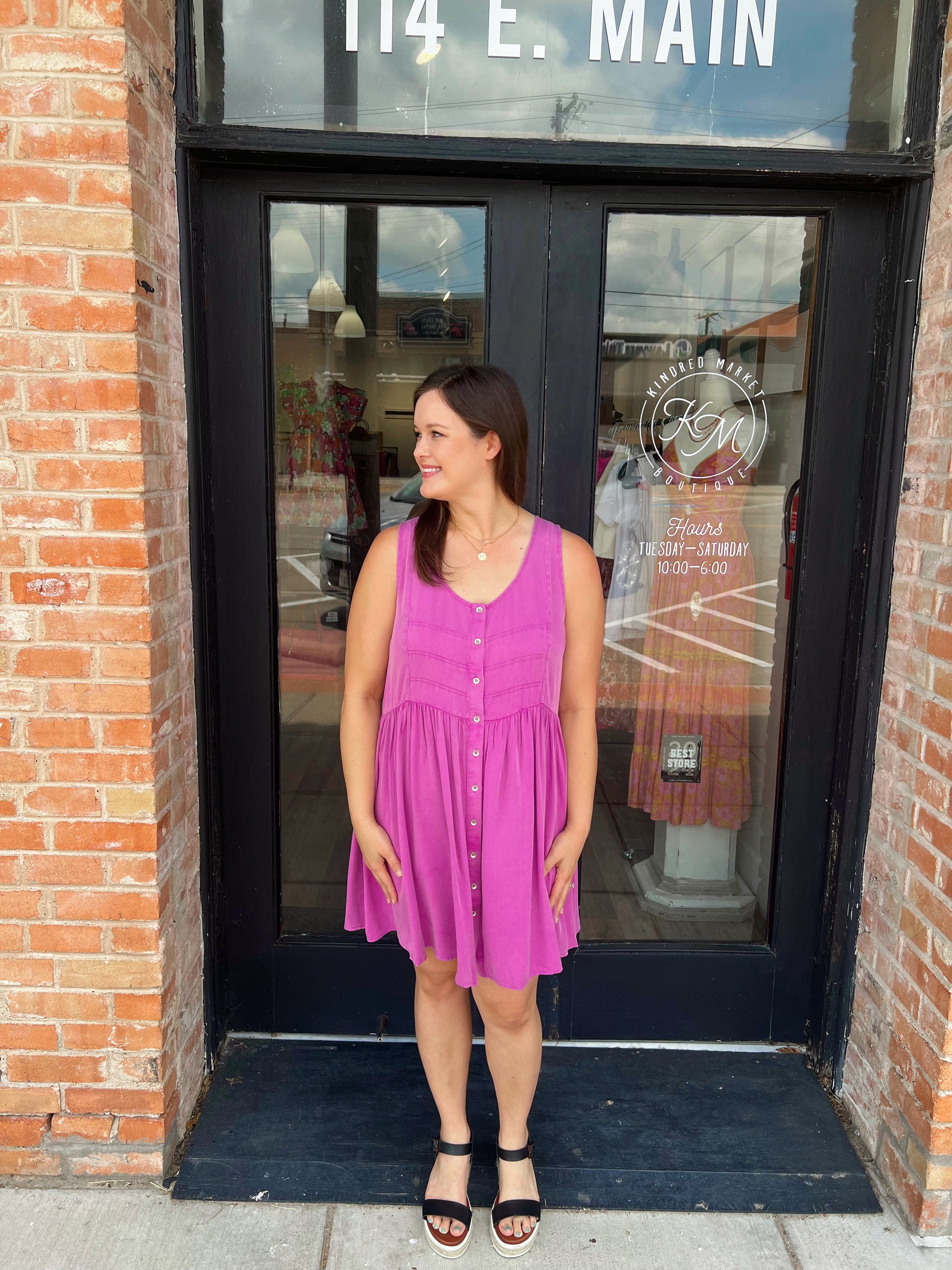 The Mabel Hot Pink Babydoll Dress is a hot pink almost purple color. It has a mineral washed fabric. It is also a button down dress. This dress is giving off concert vibes! The material is SO lightweight with a tank top neckline. It is made from 100% rayon. The fit of the dress is a mini dress. Pair this with some super cute boots to dress it up or even pair with some simple sneakers for a day out on the town.