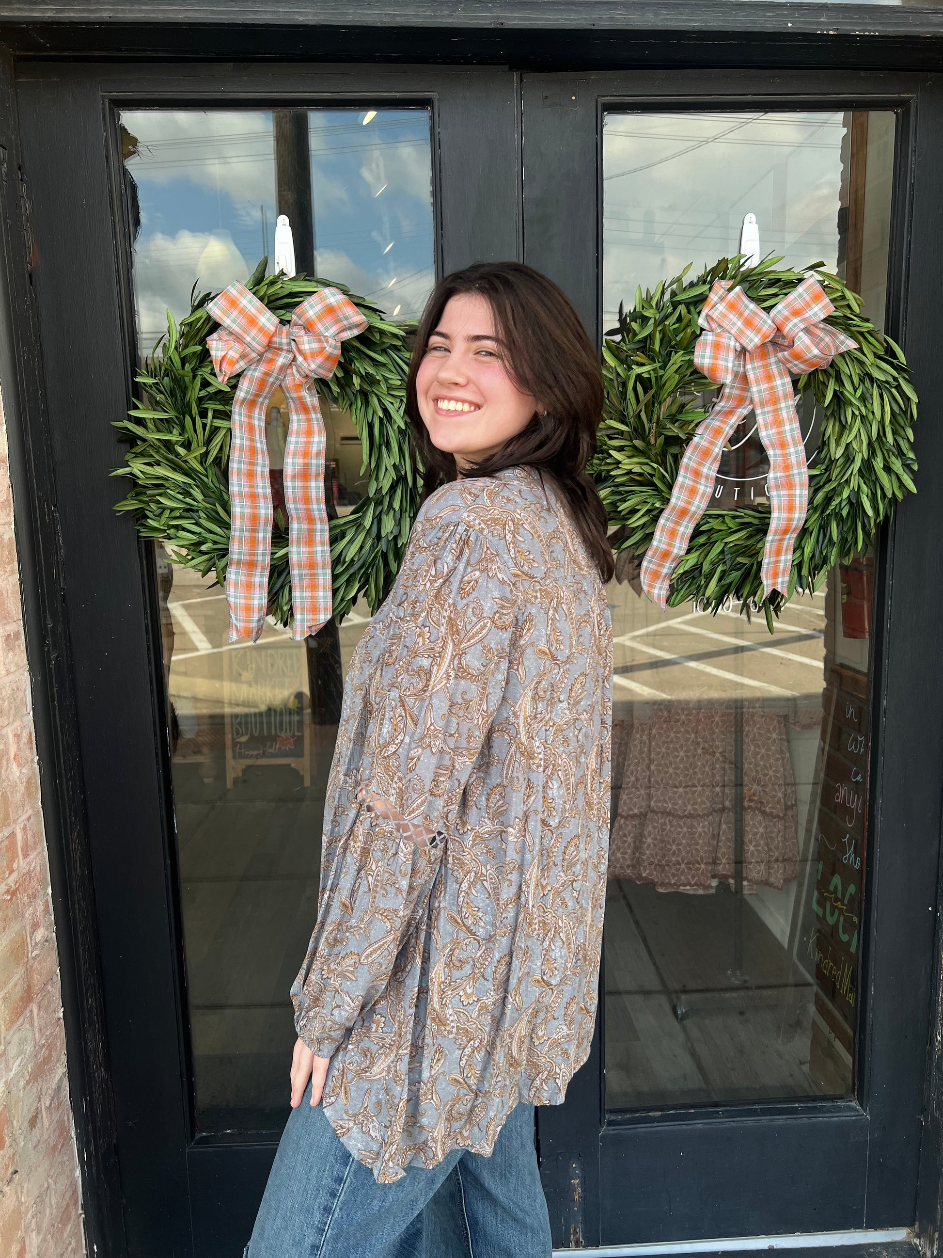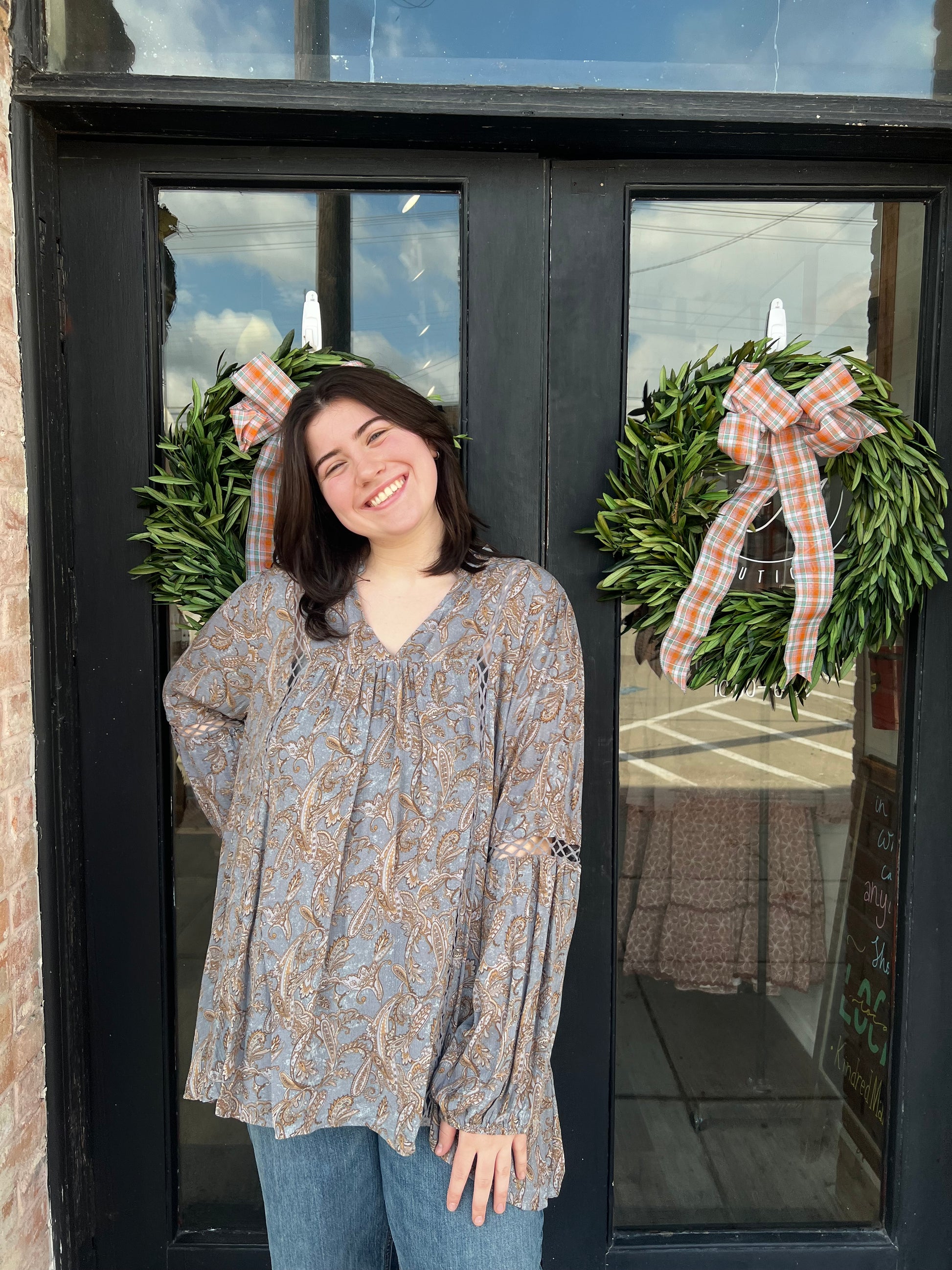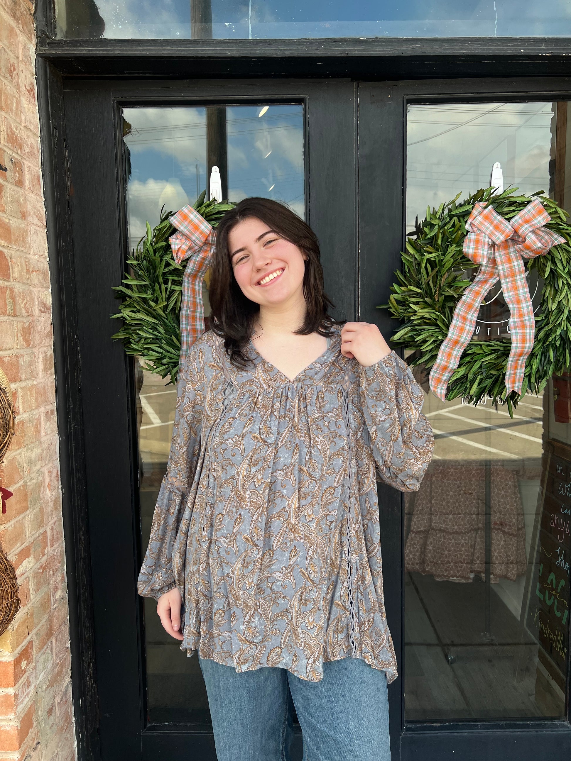 Elevate your wardrobe with the Marlene Dusty Gray Blouse, featuring a flattering V-neck and eye-catching ethnic print. Its swing tunic silhouette offers comfort and movement, while long bishop sleeves add a touch of elegance. Delicate criss-cross trimming completes the design, making this blouse a perfect choice for effortless style and confidence all day long.
