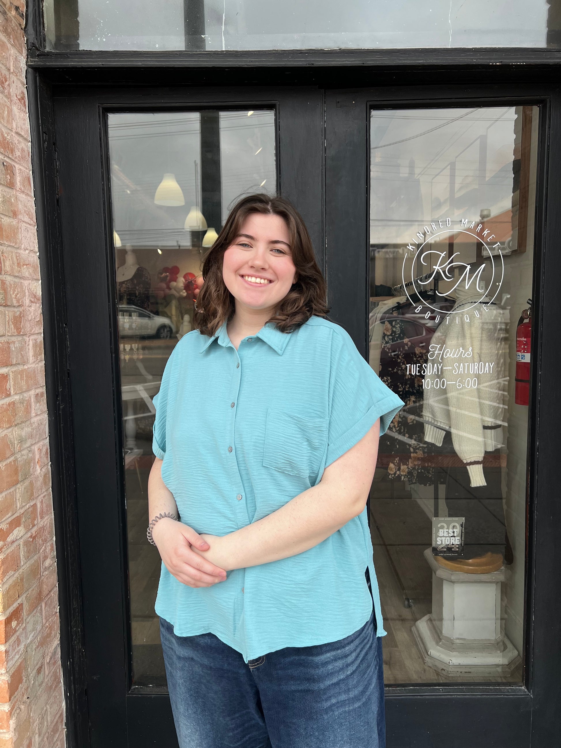 The Nova Short Sleeve Plus Button Up is a dusty teal color. This top is plus sized. It has a drop short sleeve, woven fabric, high to low hem with a slit, a front chest pocket, and a collar. It is made of 100% polyester. This top would go perfect with denim pants.