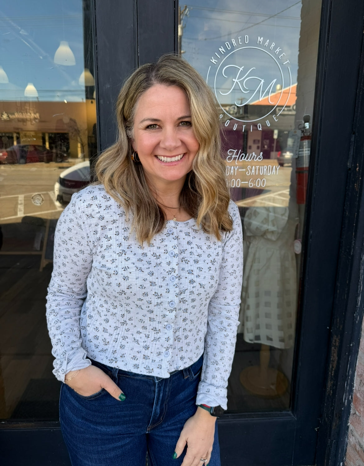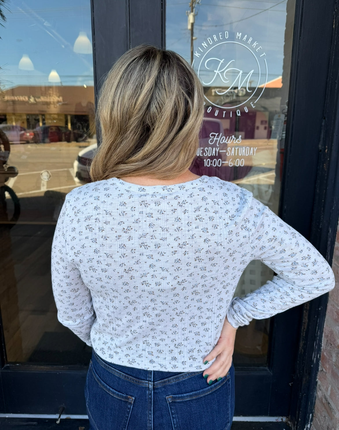 - Printed Button Down Knit Cardigan Top - Floral & Bow Print - Long Sleeve - Round Neck - Christmas Outfit (Model height: 5"2