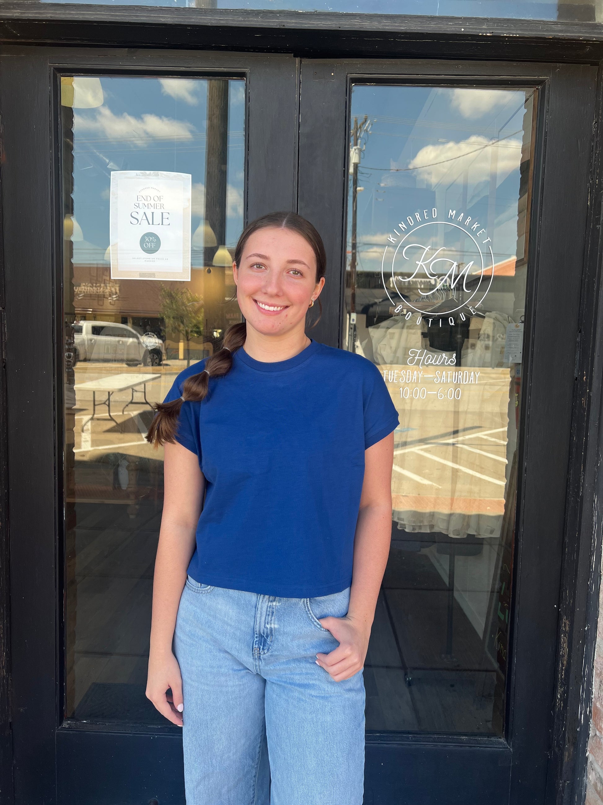 Elevate your casual wardrobe with the Olivia Cropped Navy Tee. This stylish navy t-shirt features a flattering cropped cut that pairs perfectly with high-waisted jeans or skirts. Crafted for comfort and effortless style, it’s ideal for those who want a chic, modern look without sacrificing ease. Make a confident statement every day with this versatile essential.