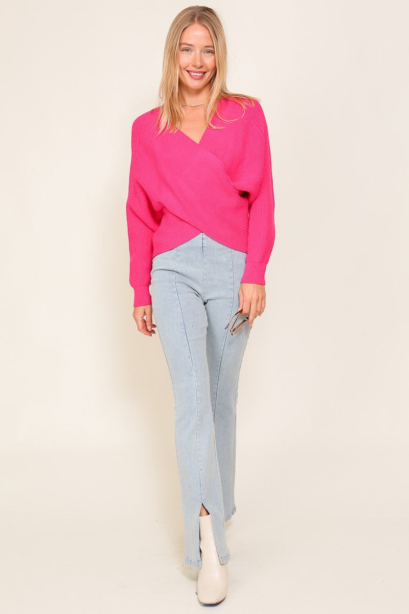 The Paisley Cross Over Front Sweater is a beautiful shade of pink. A cozy and stylish addition to your women's apparel collection. This sweater feature a unique cross over front design, long sleeves and a flattering V-Neckline, offering a perfect blend of comfort and sophistication. It's cozy knit fabric provides a comfortable and snug fit, making it ideal for cooler days or when you want to feel cozy and stylish. The standout feature of this sweater is the cross over front design. It is made from 50% viscose, 28% polyester and 22% nylon.
