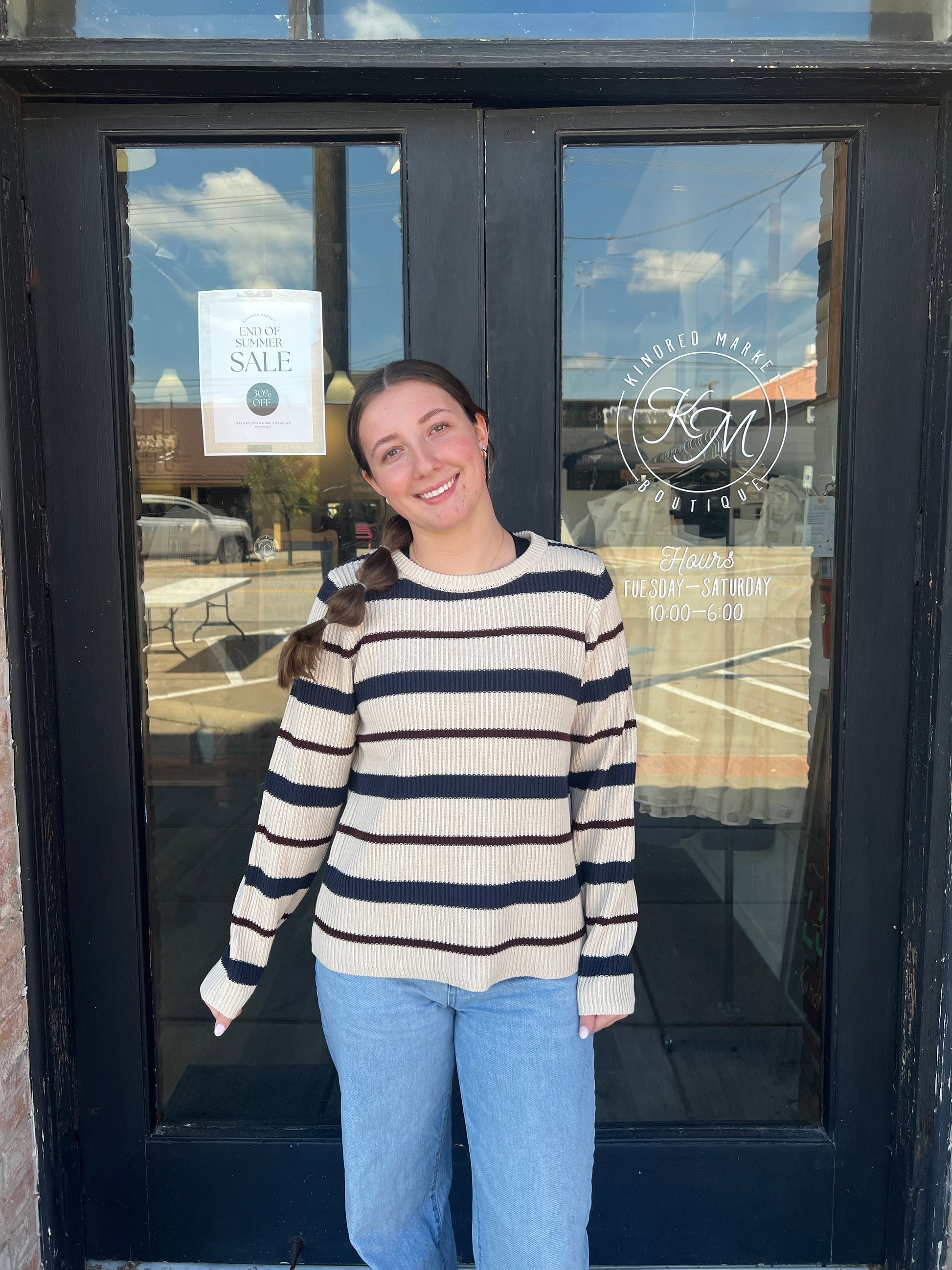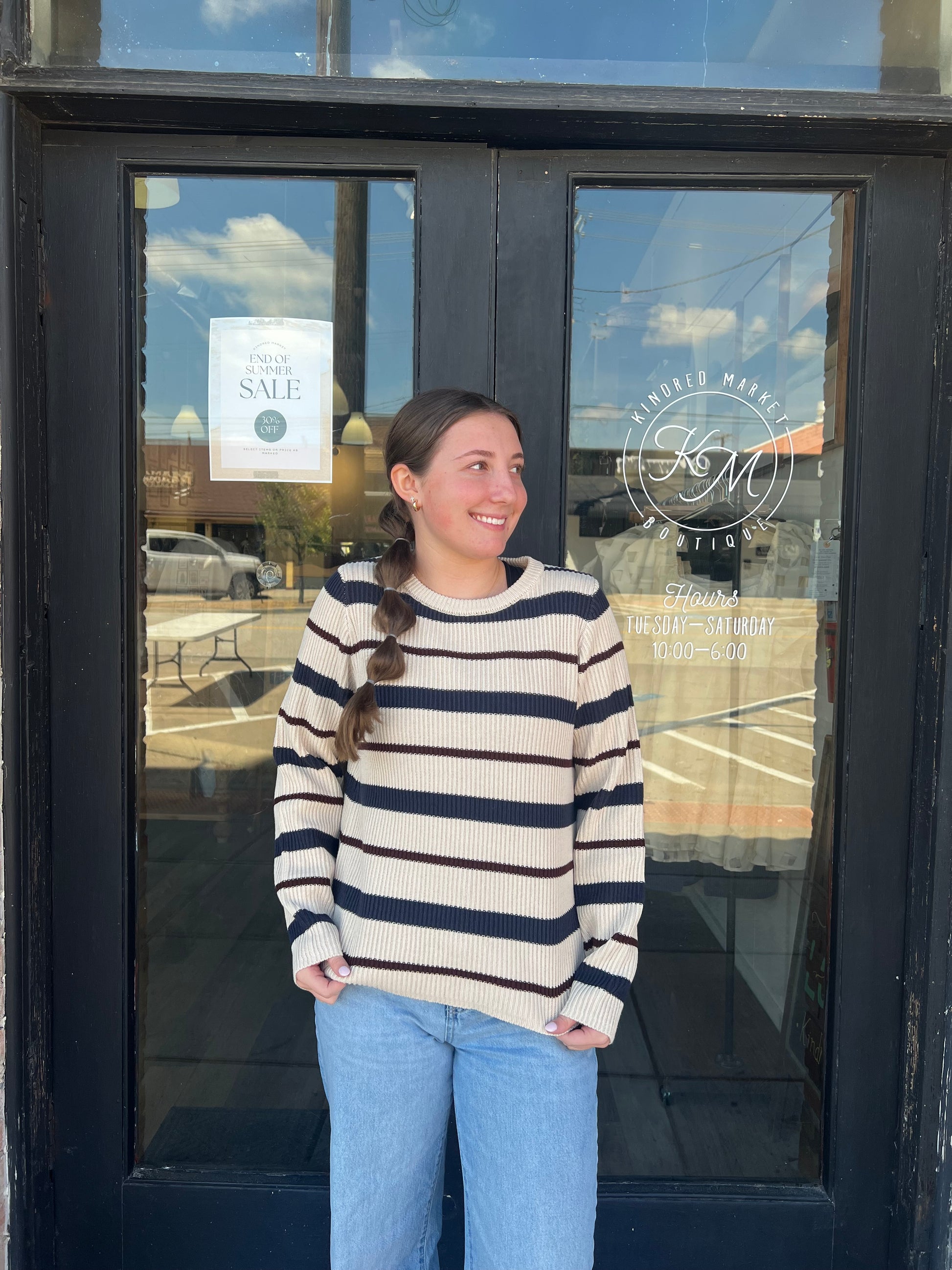 The Paisley Stripe Ribbed Sweater is available in two stylish versions: navy stripes and a green, tan blend. Crafted from ribbed knit fabric, it offers a comfortable fit with a timeless look. Perfect for layering or wearing on its own, this sweater adds cozy sophistication to any wardrobe. Choose your favorite color to elevate your everyday style effortlessly.