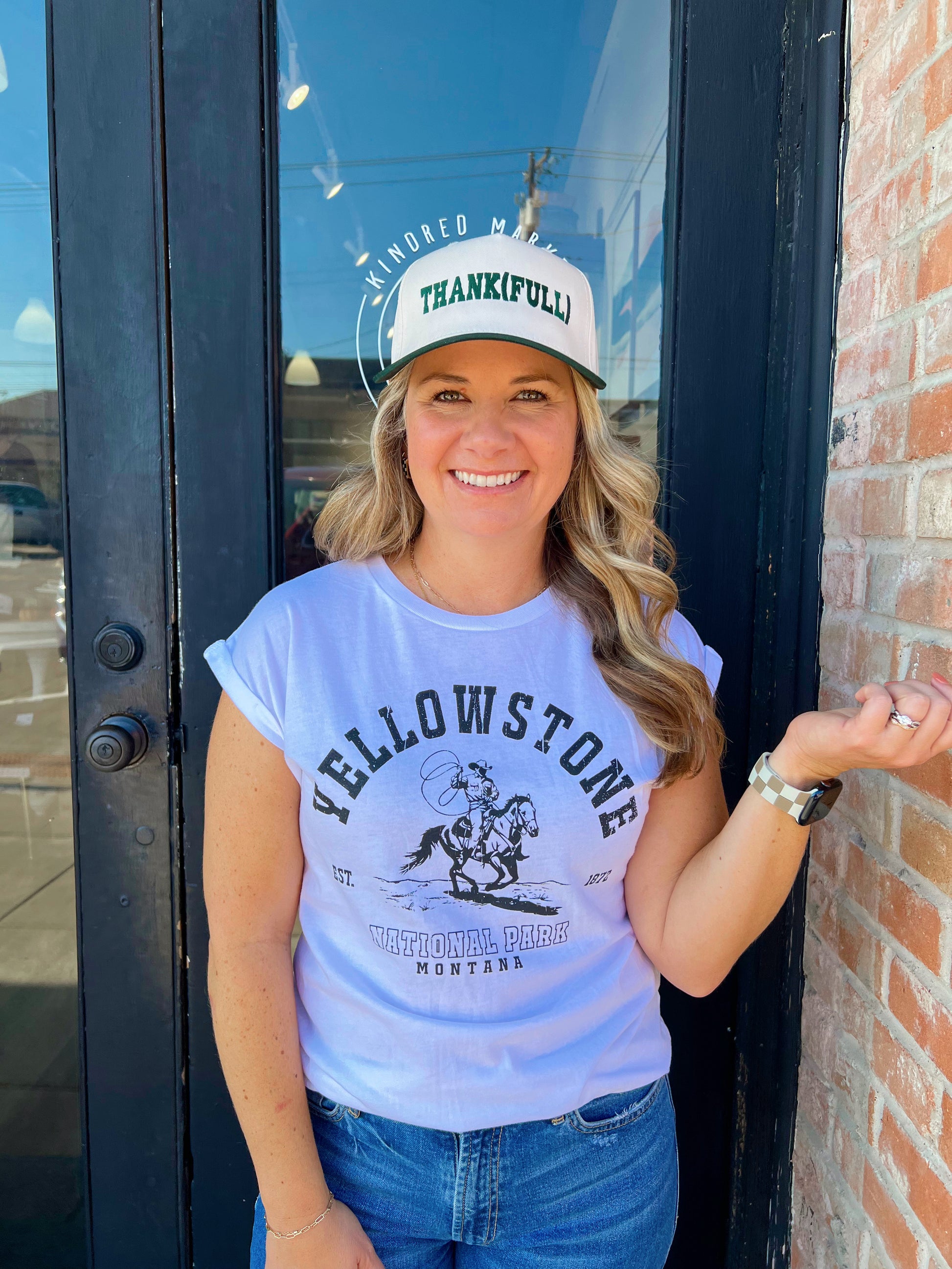 The Stella Yellowstone National Park Graphic Tee is such a fun neutral basic! It is a plain white regular length graphic tee with black graphics and writing. The sleeves have a cap roll up sleeve fit. The feel of this is so comfortable. Its one you will put on and want to wear all the time. The material is made from 100% cotton. Pair this with a super cute colored pair of denim or legging and a trucker hat.