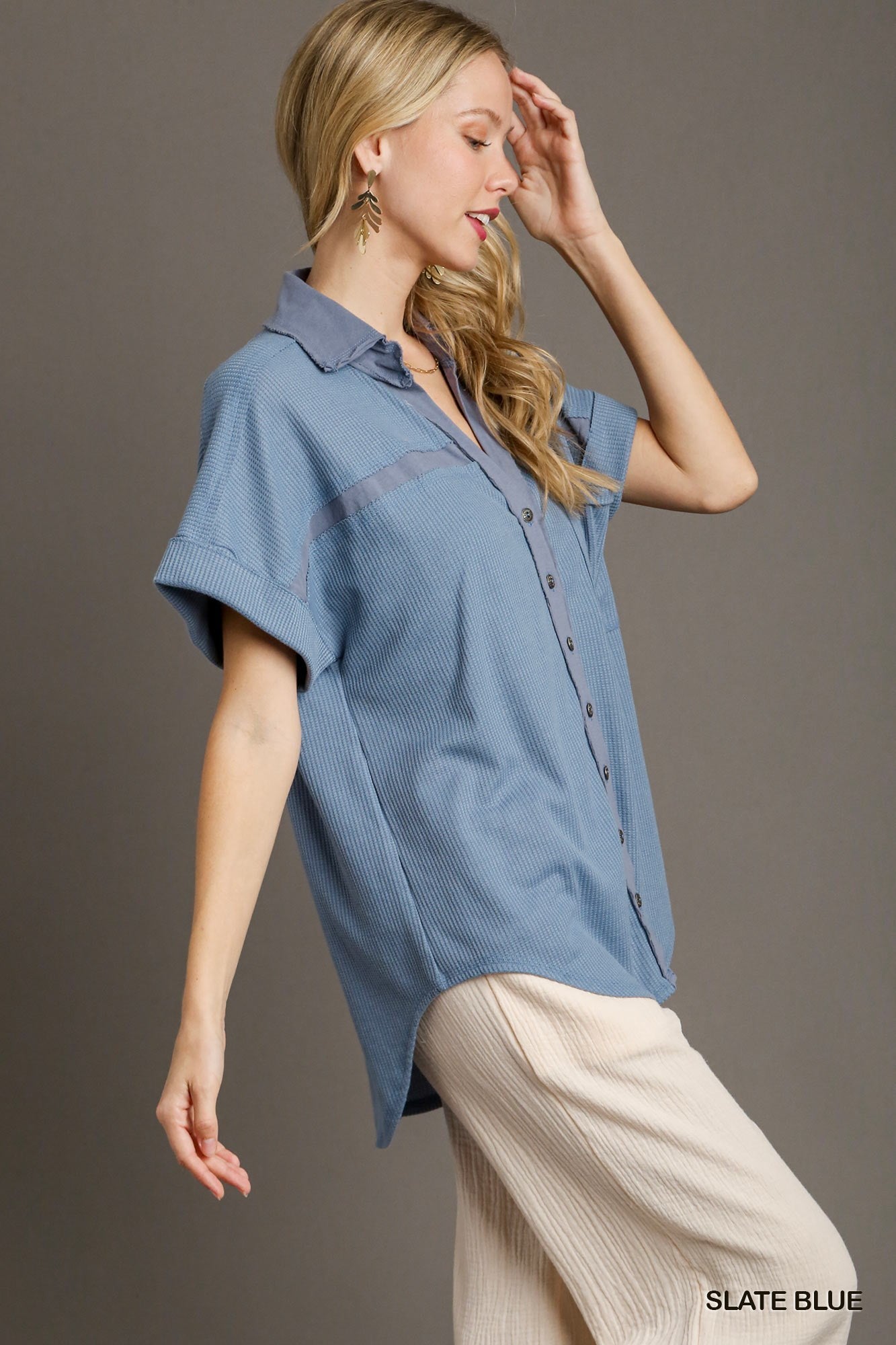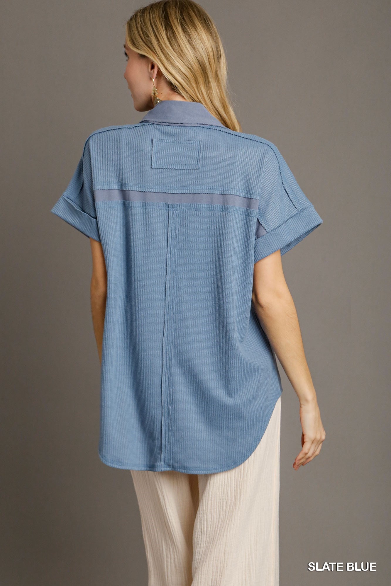 Elevate your summer wardrobe with this Slate Blue mixed media waffle knit button-down top. Featuring short folded sleeves and a stylish high-low hem, it offers a perfect blend of comfort and modern design. The breathable waffle knit fabric keeps you cool, while the button-down front adds versatility for effortless layering. Ideal for warm days when you want to look polished yet relaxed.