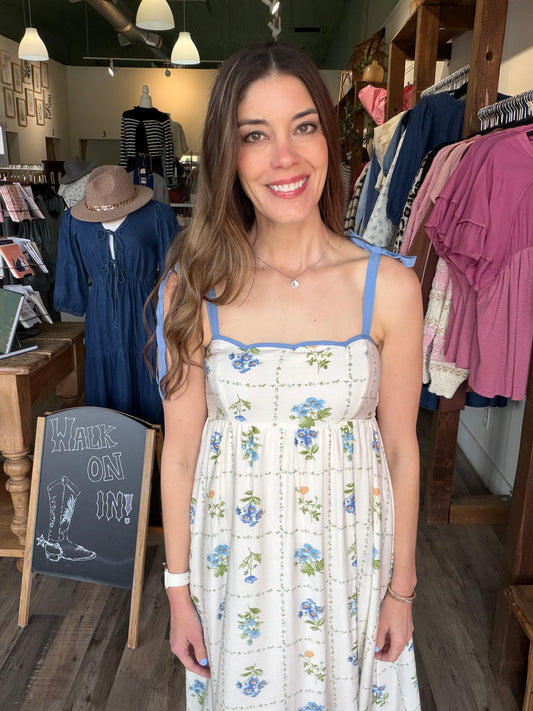 FLORAL TILE PATTERN SCALLOPED TIE STRAP MIDI DRESS
