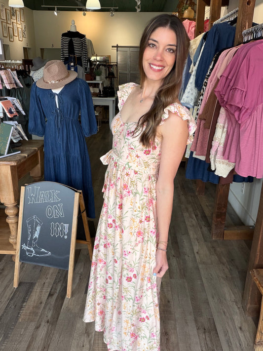 FLORAL WAIST TIE FRONT SLIT SLEEVELESS MIDI DRESS